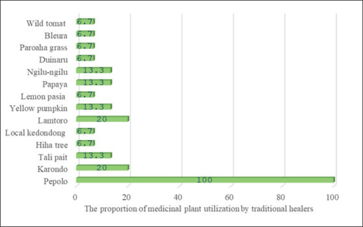 Fig. 1. Proportion of plant usage by Napu ethnic traditional healers for helminthiasis treatment based on local wisdom, 2024. Dosage and consumption patternsThe Napu ethnic community possesses profound knowledge about helminthiasis and its treatment. Most informants reported no specific rules for consuming MP, with usage being flexible and without precise dosages. However, one informant recommended consuming Pepolo in the morning before meals for greater effectiveness, as worms are believed to be more active in searching for food at that time. Regarding the perceived effects of MP, the Napu people believe that plants such as Pepolo are highly effective in treating helminthiasis. After consumption of MP, worms are typically expelled with feces within a few hours or by the next day. Informants reported that: Large worms (Kaindoro) are often visible during defecation, and small worms (Luhoa) are believed to be expelled as well. The community perceives these MP as having no side effects and considers them safer than modern chemical drugs. In addition, Pepolo is valued for its other benefits, such as quenching thirst when in the forest without access to water. Changes in trends in traditional medicineThe Napu ethnic community continues to use traditional MP. However, some informants mentioned that the younger generation tends to prefer modern deworming medication from health centers, as it is considered more practical. Despite this shift, the community still maintains their belief in the efficacy of MP as part of their cultural heritage. The trust in the effectiveness of local MP remains strong, although it is gradually changing with the availability of modern medications. DiscussionTraditional medicine is believed to provide healing benefits for various health complaints and continues to evolve. Approximately 80% of the population in developing countries relies on traditional medicine, particularly that derived from plants (Kristiyanto et al., 2020). Several factors influence people’s perceptions, beliefs, and interest in traditional medicine, including knowledge, cultural practices that are passed down through generations, and social status (Abdelmola et al., 2021), as well as factors such as religion, marital status, occupation, age, and education level (Chali et al., 2021). The ease of accessibility and financial affordability, along with the inclusion of traditional medicine in government health insurance, are factors that influence people’s preference for traditional medicine (Legesse and Babanto, 2023). The availability of health care facilities is closely linked to geographical conditions, with rural or more remote communities using traditional medicine more than urban populations (Febriyanti et al., 2024). The use of traditional medicine in Indonesia has increased in recent years. Although most of the population (73.8%) uses traditional health care services, the proportion remains limited and unevenly distributed across provinces (Rifka and Idris, 2023). Traditional medicine is used not only for treatment but also for maintaining health, prevention, diagnosis, and the improvement or treatment of both physical and mental conditions (Hoenders et al., 2024). Traditional medicine practices are vast and diverse across countries. Traditional medicine is commonly used in Indonesia for degenerative diseases, such as cancer or malignant tumors, arthritis/rheumatism, high cholesterol, stroke, diabetes, and kidney disease (Pengpid and Peltzer, 2018). In other countries, coughs, headaches, and intestinal/stomach infections are common ailments treated with traditional medicine. The failure of pathogens to respond to therapeutic agents is one of the challenges in treating infections, leading to chronic infections, complications, and preventable deaths (Rizvi et al., 2022). Traditional medicine, especially plant-based remedies, holds great potential for addressing infections because plants synthesize various compounds with diverse biological activities. Several plant extracts, including anthelmintics, have shown potential for development (Jayawardene et al., 2021). The concept of helminthiasis among the Napu ethnic community in Central Sulawesi is not only a medical issue but also carries complex cultural and ecological dimensions. In Napu’s local knowledge, helminthiasis is perceived as a condition linked to the balance between humans, the environment, and unseen natural forces. As described by Hamzari and H (2011) in his study of communities in the Lore Lindu region, local health perspectives are closely tied to traditional practices, ecological values, and the utilization of natural resources (Hamzari and H, 2011). The Napu people generally associate helminthiasis with consumption patterns, forest and agricultural land management, and water quality. As a result, the management of helminthiasis extends beyond medical interventions with anthelmintic drugs, incorporating environmental and social strategies. This concept aligns with previous research on helminthiasis in Indonesia, emphasizing the importance of understanding cultural contexts, risk factors, and local lifestyles in developing effective control programs (Gupta et al., 2021). Anthropological research on the Napu community shows that their understanding of diseases, including helminthiasis, is often intertwined with the construction of ethnic identity and socio-economic adaptation. The Napu people do not merely view helminthiasis as a “disease” that needs to be cured but also as a symptom of the disruption of harmony between humans and nature. For instance, adaptations to changes in agricultural practices and deforestation around the Lore Lindu National Park can influence the distribution of intestinal parasites and the risk of helminth infections. In this context, previous research focusing on the epidemiological and socio-cultural factors of helminthiasis provides an important foundation for a more holistic understanding of t