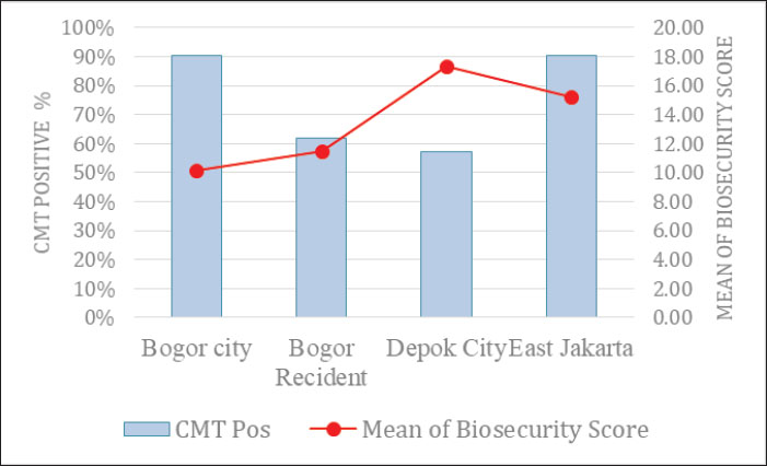Fig. 2. CMT positivity percentage and mean biosecurity score by location. (Source: Authors’ own data analysis, 2025).