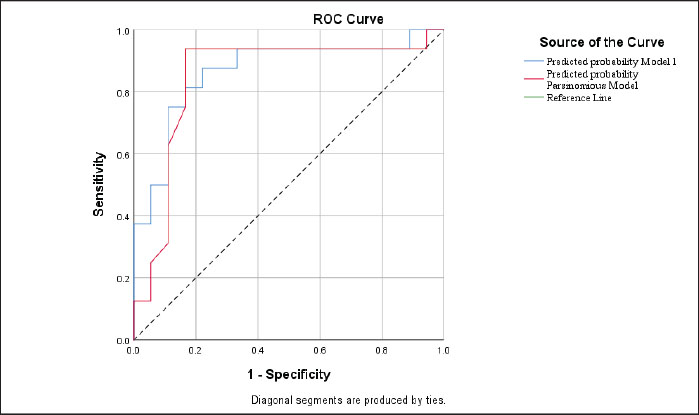 The ROC curve analysis showed good discriminative performance for both models in distinguishing mild from moderate SCM. The full model achieved an AUC of 0.865, whereas the parsimonious model achieved an AUC of 0.845 (Fig. 3). A note of tied predicted probabilities was reported in the ROC output, which may slightly influence the AUC estimate precision. These findings indicate that both models can discriminate between mild and moderate SCM (Fig. 3).