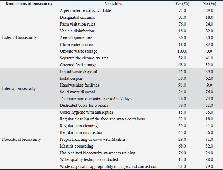 Biosecurity practices were assessed using a validated questionnaire adapted from livestock health and hygiene guidelines (Pedersen et al., 2023). The instrument comprised three dimensions: external biosecurity (9 items; e.g., controlled farm entry, visitor/vehicle hygiene, quarantine practices, and feed/water protection), internal biosecurity (6 items; e.g., separation of clean/dirty areas, waste management, and availability of hygiene facilities), and procedural biosecurity (9 items; routine operational measures related to milking and hygiene, including udder hygiene, cleaning/disinfection routines, and handling of cows suspected of mastitis). Each item was scored dichotomously (1=implemented, 0=not implemented). Subscores were calculated for external (0–9), internal (0–6), and procedural (0–9) biosecurity and summed to obtain a total biosecurity score (0–24). Based on score distribution and prior validation (Pedersen et al., 2023), farms were classified as having adequate biosecurity (score ≥12; ≥50% compliance) or inadequate biosecurity (score <12). The cutoff was supported by pilot testing (n=5 farms) and expert consultation.