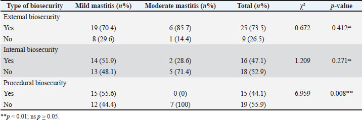 Table 4. Chi-square results between biosecurity and SCM severity level (mild vs. moderate).