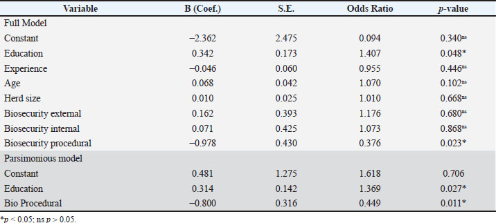 Binary logistic regression was performed to identify farmer- and farm-level SCM severity predictors (0=mild; 1=moderate). In the full model (Model 1), education level was positively associated with the odds of moderate SCM [odds ratio (OR)=1.407, 95% confidence interval (CI): 1.003–1.975; p=0.048], whereas adequate procedural biosecurity was associated with lower odds of moderate SCM (OR=0.376, 95% CI: 0.162–0.874; p=0.023). Other covariates (experience, age, flock size, and external and internal biosecurity) were not herd size different (p > 0.05). The parsimonious model (Model 2), including only education and procedural biosecurity, produced consistent estimates (education: OR=1.369, 95% CI: 1.036–1.809; p=0.027; procedural biosecurity: OR=0.449, 95% CI: 0.242–0.835; p=0.011). The detailed regression results are presented in Table 5.