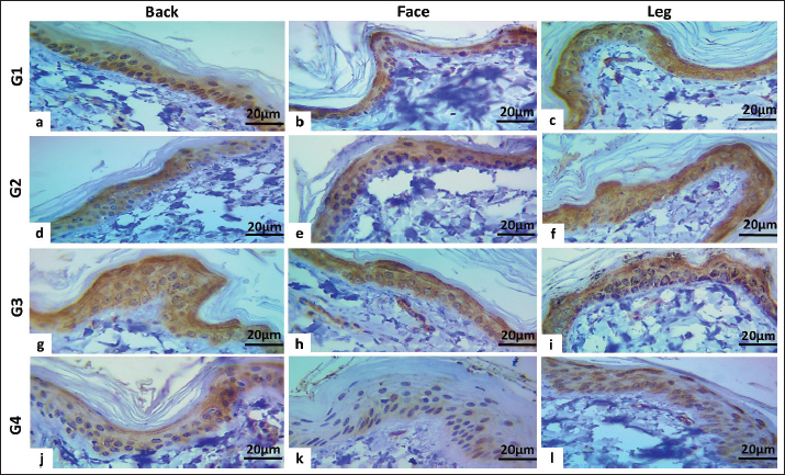 Fig. 7. Immunohistochemical staining of cytoplasmic expression of CGN in the epidermis of aged female dogs: a–c: Moderate-strong positive staining (score 12, 65%). d: Moderate positive staining (score 9, 60%). e and f: Moderate-strong positive staining (score 12, 65%). G–i: Moderate positive staining (score, 9; 60%). j: Weak-moderate positive staining (score=6, 55%). k: Weak positive staining (score 2, 40%). l: Weak-moderate positive staining (score=6.0, 50%). The CGN expression in female dogs was revealed; in group one, at a different locations high expression was seen (Figs. 7a–c and 8d). In group two, the peak expression level was observed in the face and legs (Figs. 7d–f and 8d) versus group three, the same pattern of expression was observed, which showed the maximum level in the leg and the lowest degree in the face region (Figs. 7g–i and 8d). The aged groups had the same pattern of CGN expression in the back (weak-moderate) and face (weak) as the leg region in which high level seen (Figs. 7j–l and 8c and d). DiscussionThe skin serves as the epithelial surface at the forefront of host defense due to its distinct anatomical position, protecting and minimizing damage from both routine and extreme environmental factors. Diseased skin typically exhibits diminished barrier function. Understanding the organization and barrier function of diseased skin requires an investigation of the histologic structure of TJs in healthy skin and the interactions between keratinocytes and existing stem cells. As the basis of the previous study, the current study was conducted using histomorphometric measurement to assess the average number of apoptotic cells, mitotic cells, and epidermal thickness of three skin regions among four different ages of male and female dogs, in addition to immunohistochemical localization and gene expression of the CGN as an epidermal TJ protein and CD34 as a stem cell. To the best of our knowledge, this is one of the first studies in veterinary medicine to be carried out in this field in our region and country (Iraq). The results obtained in this study are for all ages of male dogs; the total apoptotic body count generally showed significant differences in the young (under 1 year) and oldest group (4–6 years) in the back and face, but in the leg, the outcome was non-significant, while the MF count mostly revealed significant differences in each skin area, especially in older dogs, particularly in the back and leg regions. In the case of epidermal thickness, the noteworthy thickness was clear mainly among the youngest and oldest male dogs. The data is similar to the results that proved that the balance between the processes of cell division and programed cell death controls the number of cells and preserves proper epidermal thickness (Raj et al., 2006). In addition, Bowen et al. (2003) showed that apoptosis plays a vital role in skin homeostasis. Apoptotic cell death is essential for the development of the stratum corneum and for maintaining the natural balance of keratinocyte proliferation (Bowen et al., 2003). According to available evidence, apoptotic cell counts can dramatically increase throughout normal growth and aging, as well as during disease (Elmore, 2007). This is an explanation for why the number increased mostly in the young group, which is related to growing up, while in the oldest group, it is also a normal physiological mechanism that increases with advancing age. The comprehensive impact of apoptosis on disease pathophysiology makes therapeutic intervention possible at a variety of checkpoints. The present data, in all regions of female dogs, aged 1–2 years, showed the highest number of apoptotic bodies count with a clear, significant difference. Furthermore, the MF count showed a significant increase in the youth and oldest groups in the back and face regions. In line with previous data, the uptake of these apoptotic bodies can deliver mitogenic (proliferation-stimulating) signals, such as Wnt signaling, which encourages the proliferation of healthy stem cells to maintain tissue numbers (Brock et al., 2019). In addition, this process of apoptotic body engulfment provides a regulatory mechanism that links cell death and division, helping to maintain the overall population of stem cells and contributing to epithelial tissue homeostasis (Huang et al., 2011). Regarding epidermal thickness in female groups, at all regions, the groups of (1–2 and 4–6 years) represent the highest thickness significantly. This is in agreement with the young group that had the thinnest epidermis, while in disagreement with groups 2 and 4 that had the thickest epidermis. A study demonstrated that promoting apoptosis can lead to thinning of the epidermis in the developing epidermis, suggesting a direct link between cell death and the overall thickness of the tissue (Soffer et al., 2022). Variations in apoptotic, mitotic, and epidermal thickness in normal skin remain inadequately understood, with limited information available. Factors such as age, location, genetic predispositions, and environmental conditions significantly influence the balance between cell division and death, ultimately affecting epidermal thickness. The investigation of mRNA levels in canine skin supports earlier findings that CD34 is present in canine skin (Pascucci et al., 2006; Kobayashi et al., 2009; Brachelente et al., 2013). This study presents the first report on the mRNA levels of CGN in the epidermis of stray dogs. Real-time RT-PCR was used to assess and compare the transcription levels of the relevant genes. Our data concerning the gene expression of CD34 and CGN in all skin areas in different ages showed various achievements, which explained the change in gene expression levels with age, as demonstrated in a previous study, which was carried out on skin and other tissues of different-aged individuals (Glass et al., 2013) in which has showing that many genes exhibit age-related expressio