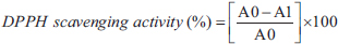 Where A0 is the absorbance of the control mixture (2 ml of DPPH solution and 1 ml of deionized water), and A1 is the absorbance of reaction mixtures (2 ml of DPPH solution and 1 ml of diluted extracts or standard solutions at different concentrations).
