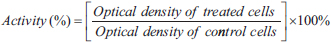 Where A0 is the absorbance of the control mixture containing 1 ml of ABTS solution and 1 ml of deionized water; A1 is the absorbance of the reaction mixtures containing 1 ml of ABTS solution and 1 ml of the diluted extracts or standard solutions with varying concentrations.