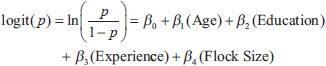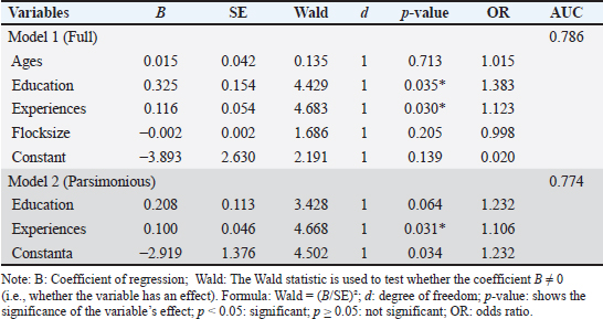 where p represents the probability of a farmer exhibiting a high level of AWK or AWP. Regression coefficients (β) describe the direction and strength of associations, whereas odds ratios (OR=e^β) indicate the change in likelihood associated with a one-unit increase in each predictor. To evaluate the discriminatory performance of significant predictors, the receiver operating characteristic (ROC) curve analysis was conducted. The AUC was interpreted using conventional thresholds: <0.6=poor, 0.6–0.7=fair, 0.7–0.8=moderate, and >0.8=good discrimination (Çorbacıoğlu and Aksel, 2023). A significance level of p < 0.05 was applied throughout the study. Ethical approvalThis study was reviewed and approved by the Humanities Research Ethics Committee, the Ethics Committee on Social Studies and Humanities, and the National Research and Innovation Agency on July 4, 2023, with approval number 450/KE.01/SK/07/2023. All procedures complied with the principles of the Declaration of Helsinki and the COPE guidelines for human participants. Participation was voluntary, and informed consent was obtained before data collection. The respondents were assured of anonymity and confidentiality, and the data were used solely for research. ResultsCharacteristics of the duck farmersThe characteristics of duck farmers in Bekasi (Table 1) revealed that most were in the productive age group of 41–55 years (72.41%), with a predominance of low educational attainment, as nearly half (48%) had only completed elementary school, and only 7% had college or university education. Farming experience was relatively balanced, with the largest proportion having 10–20 years of experience (38%), while flock sizes varied, though small to medium operations (<200–500 birds) were more common (72%) compared to large flocks (>500 birds, 28%). Table 1. Characteristics of Bekasi duck farmers (n=29).