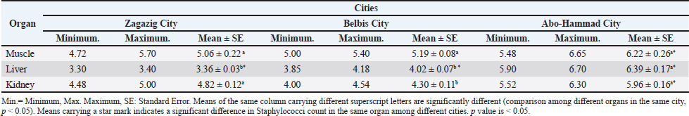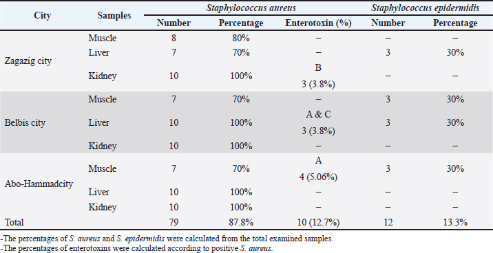 As described in the serological identification of Staphylococcus spp. in the examined camel meat samples (N=10 of each) declared that S. aureus was detected in all kidney samples (100%), in 8 (80%), 7 (70%), and 7 (70%) of muscle samples collected from Zagazig, Belbis, and Abo-Hammad cities, respectively, in 7 (70%) of liver samples collected from Zagazig city and in all liver samples (100%) collected from Belbis and Abo-Hammad cities. Staphylococcus epidermidis was detected in 3 (30%) of muscle samples collected from Belbis and Abo-Hammad cities and in 3 (30%) of liver samples collected from Zagazig and Belbis cities. Results recorded in this study also indicated that the overall prevalence of S. aureus was 87.8% (79 samples out of 90), while the overall prevalence of S. epidermidis was 13.3% (12 samples out of 90). The obtained results revealed that the overall prevalence rates of S. aureus in the examined muscle, liver, and kidney were 73.33%, 90%, and 100%, respectively. The obtained data also showed the prevalence of enterotoxins in the isolated S. aureus strains. It was found that only kidney isolates from Zagazig city carried the SEB gene, with a percentage of 3.8%. Similarly, the SEA + SEC genes were found in S. aureus isolated from liver samples in Belbis city, also at a rate of 3.8%. The SEA gene was detected in muscle isolates from Abo-Hammad city samples at a percentage of 5.06%. In contrast, liver and kidney isolates from Abo-Hammad city did not produce any types of enterotoxins. The obtained results declared that 10 isolates out of 79 positive S. aureus contained enterotoxins with a percentage of 12.7%. The SEA was the most common enterotoxin produced in the 79 tested isolates, with a rate of 5.06%, followed by SEB and (SEA + SEC), with percentages of 3.8% for each. In contrast, S. aureus isolates from the examined camel meat samples failed to produce SED (Table 2). Table 2. Total Staphylococci count Log10 (CFU/g) in the examined camel meat samples (N=10 of each).