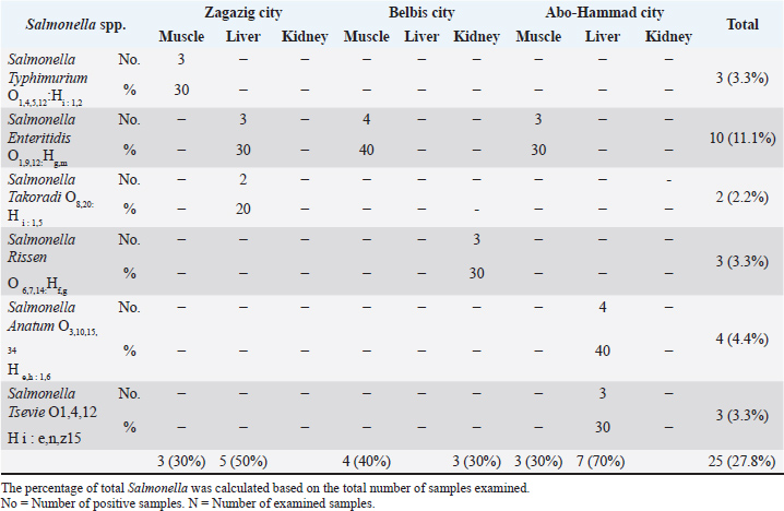 The results showed that the prevalence of Salmonella in camel muscle and liver samples from Zagazig city was 3 (30%) and 5 (50%), respectively, while kidney samples were free from Salmonella. Regarding Belbis samples, Salmonella prevalence in camel muscle and kidney samples was 4 (40%) and 3 (30%), respectively, while Salmonella was not detected in liver samples from the same city. Camel muscle and liver samples from Abo-Hammad city had Salmonella prevalence rates of 3 (30%) and 7 (70%), respectively, with no prevalence in kidney samples. It was declared that 25 samples (27.8%) of the total examined 90 camel meat and offal samples were positive for Salmonella. It was clear that Zagazig and Abo-Hammad liver samples had the highest Salmonella incidence rates; 5 samples (50%) and 7 samples (70%), respectively, followed by Belbis muscle samples with an incidence rate of 4(40%), while the lowest incidence rates were recorded in Zagazig, Abo-Hammad muscle samples, and Belbis kidney samples with an incidence rate of 3(30%) for each. The serological identification of Salmonella isolates declared that S. Typhimurium, S. Enteritidis, S. Takoradi, S. Rissen, S. Anatum and S. Tsevie were detected in 3 (3.3%), 10 (11.1%), 2 (2.2%), 3 (3.3%), 4 (4.4%) and 3 (3.3%), respectively, from the total examined camel muscle, liver and kidney samples from the three cities (Table 5). Table 5. Prevalence of Salmonella spp. in the examined camel meat samples (N=10 of each).