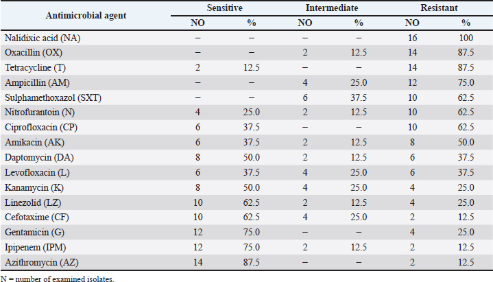 Camel meat isolates were tested for antimicrobial susceptibility profile (n=26). Data declared that all isolates were resistant to kanamycin (100%). Staphylococcus aureus isolates had high resistance against ampicillin (96.2%), tetracycline (84.6%), cefotaxime (73.1%), nalidixic acid (73.1%), ciprofloxacin (65.4%), and sulphamethoxazole (61.5%). Staphylococcus aureus isolates were highly sensitive to nitrofurantoin and daptomycin (92.3%), linezolid (80.8%), amikacin (73.1%), oxacillin (69.3%), and ipipenem (61.5%) (Table 3). Table 3. Antimicrobial susceptibility of Staphylococcus aureus isolated from the examined camel meat samples (N=26).