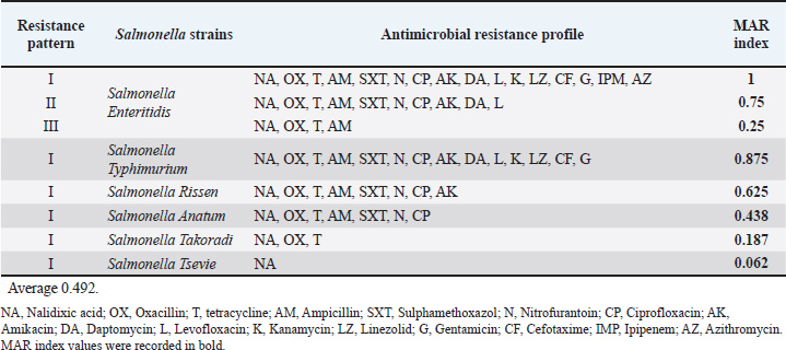 The results clarified the antibiotic resistance profile of the identified Salmonella isolates to sixteen antibiotics and revealed that S. Enteritidis showed multidrug resistance with three resistance patterns, and MAR index values ranged from 0.25 to 1. While S. Typhimurium, S. Rissen, S. Anatum, S. Takoradi, and S. Tsevie had one resistance pattern with MAR index values of 0.875, 0.625, 0.438, 0.187, and 0.062, respectively. The isolates' MAR index ranged from 0.187 to 1, with an average of 0.492 (Table 7). Table 7. Antimicrobial resistance profile (MAR index) of Salmonella spp. isolated from the examined camel meat samples (N=16).