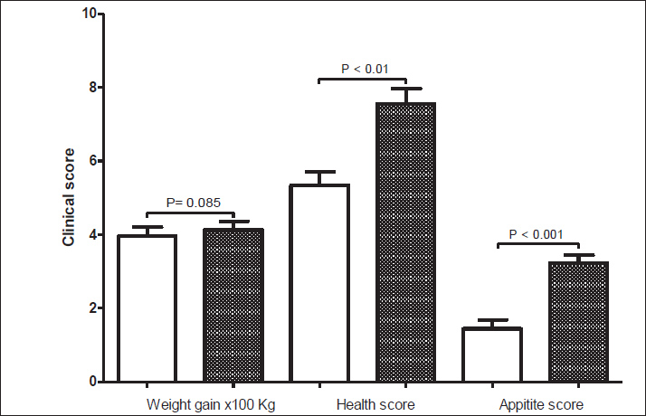 Fig. 1. Clinical scores before and 6 weeks after treatment with milk thistle extract in dromedary camel suffering from elevated levels of liver enzymes in the blood. Table 2 details the changes in hematological values in control, diseased, and treated camels. Notably, the diseased camels showed some alterations in WBC, Ly%, Mo%, and NE%, and RBC, Hb, PCV, MCV, MCH, MCHC, and PLT. After 42 days of treatment with milk thistle extract, many of these values showed a trend toward regulation. For instance, Ly% increased significantly from 36.25 ± 7.10 in diseased camels to 43.20 ± 4.71 after treatment, approaching the control group's 40.21 ± 5.50. Similarly, EO% decreased from 4.22 ± 2.10 to 3.22 ± 1.05, nearing its value in healthy camels of 3.45 ± 2.58. NE% also showed a notable decrease, but not of statistical significance, from 53.35 ± 10.20 to 40.33 ± 8.67, which is lower than the control group's 51.33 ± 11.25. Table 2. Mean, SEM, and range of hematological values in control and diseased dromedary camels before and after 42 days of treatment with milk thistle extract. p values calculated between parameters in diseased camels before and after treatment.