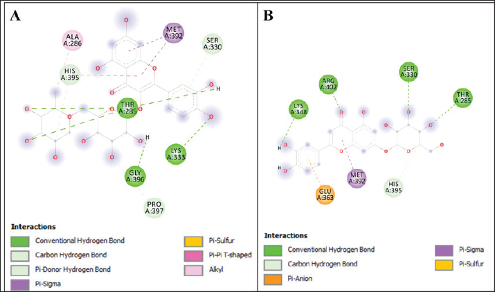 Fig. 2. Interaction profile of rutin (A) and luteolin-7-o-glucoside (B) against MRC1 (pdb code: 5GRR). DiscussionPhenolic compounds are small molecules characterized by the presence of one or more phenol groups in their chemical structure. This group of compounds can be divided into smaller groups, including flavonoids, tannins, and phenolic acids, which are found in plant extracts (Ponnusamy et al., 2011; Ćavar Zeljković et al., 2021). Plants produce a wide variety of polyphenols and many other compounds that are used to protect against various pathogens and UV radiation. Numerous factors, including physiological-biochemical, molecular-genetic, and environmental factors, influence polyphenol biosynthesis and accumulation in plants. The solubility of these compounds also depends on the type of solvent used (Ksouri et al., 2008; Del Socorro Sánchez Correa et al., 2023). The ECEs of Os and OFI0, collected from Libya, exhibited high polyphenol levels (112 and 98.33 mg GAE/g, respectively), and prior research on O. ficus-indica fruit extract also documented its total phenolic content, which showed a value of 59.48 GAE/100 g dry weight (Medina-Pérez et al., 2019). The flavonoid concentrations of the examined samples were higher than those reported by Dib et al. (2013) (11.86 mg CAT/g of DW) (Dib et al., 2013). The total tannin contents of the two ECEs of Os and OFI0 were 0.093 and 0.408 mg CAT/g, respectively. The tannin contents in Os extracts were significantly higher than those in the OFI0 ECE. These findings are similar to the results found by Haile et al. (2016) in the same species grown in Ethiopia. In fact, the flavonoid and tannin contents from the ECE showed the same pattern, with the Os extract having the highest contents and the OFI0 extract having the lowest contents. The tannin content was the lowest, with a value of 1 mg CAT/g. LCMSMS analysis for phenolic and flavonoid compounds in the ethanolic extracts for Os and OFI0 showed 29 compounds. The 29 compounds in the ethanolic extracts included 8 phenolic acids and 21 flavonoids. The concentrations of the identified compounds ranged from 0.01 to 2251.85 ppm. Caffeic acid had the lowest concentration (0.01 ppm) in the ECE of Os. Rutin in the ECE of OFI0 had the highest concentration (2251.85 ppm), as reported previously (Rosiak et al., 2023; Wang et al., 2023). Regarding the flavonoid compounds present in the ECE of Os, hyperoside was the most abundant component in the extracts, with a concentration of 12.5 ppm. Similar results were achieved by Dib et al. (2013), Boutakiout et al. (2018), and Wit et al. (2013). On the other hand, the OFI0 extract showed different results, where rutin was the most abundant flavonoid compound, with a concentration of 2251.85 ppm. These results agree with those of Belhadj Slimen and his group in 2019, who found that rutin had the highest concentration in the ECEs (31.927 mg/kg) (Belhadj Slimen et al., 2019). Transferulic acid was the main phenolic acid identified in the ECE of Os, while p-coumaric acid was the predominant phenolic acid in the ethanolic extract of OFI0. The differences in the phenolic and flavonoid contents and concentrations between the two species agree with the results reported by De Santiago et al. (2018a, b). They stated that differences in environmental conditions, the original, maturity stage, harvesting season, species type, and post-harvest treatments influence the detection and amounts of these compounds (Park et al., 2004; Djeridane et al., 2006). In the investigation of antibacterial activity, Opuntia species extracts from Libya showed efficacy against gram-positive and gram-negative germs. The antibacterial activity of Opuntia extracts may be attributed to their high polyphenol content, particularly trans ferulic acid, which has been studied for its bacteriostatic activity against E. coli, Bacillus subtilis, and S. aureus. Ferulic acid also inhibited S. aureus and E. coli (Bhattacharya et al., 2016; Pinheiro et al., 2021). Another previous study on the antibacterial activity of ethanolic extracts of O. stricta cladodes (Affi et al., 2021) reported an inhibition zone against gram-positive and gram-negative bacteria. Similar results were reported for the ethanolic extract of O. ficus indica L. mill cladode, the inhibition zone, which produces against gram-positive (S. aureus) and gram-negative bacteria (E. coli) (Blando et al., 2019). Furthermore, the ECE of OFI0 exhibited antibacterial activity against E. coli colistin resistance. Molecular docking is a powerful computational approach for predicting the binding configurations and affinities of potential drug candidates. (Elkady et al., 2022). The molecular docking approach was used in our investigation to provide deeper insights into the antibacterial potential of the compounds identified exclusively in the ethanolic cladodes extract of OFI0. These compounds were docked as ligands into key enzymes implicated in colistin resistance mechanisms. To the best of our knowledge, recent studies have reported the synergistic effect of eugenol (Wang et al., 2018) and tetrandrine (Yi et al., 2022) with colistin against clinically isolated colistin-resistant E. coli strains. Interestingly, the docking result shows that eugenol and tetrandrine interact with several active site amino acids but not with the catalytic residue, whereas Rutin and Luteoline-7-o-glucoside interact with the catalytic residues Trp 286 and His 395. The results of this study also agreed with those of Selma, W. B and colleagues tested the ability of essential oil from Tunisian Thymus algeriensis to kill gram-negative bacterial isolates that had previously shown resistance to colistin in vitro. Additionally, they confirmed the enhanced effect (synergism) achieved when this essential oil and colistin were administered together against the colistin-resistant E. coli strains carrying the mcr-1 gene. Furthermore, a docking study showed that carvacrol exhibited high 