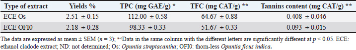 Biological activitiesMIC and MBC antibacterial activities of O. cladode extractsThe antibacterial activity of the O. cladodes extracts was assessed using the agar diffusion method. The microorganisms examined in this study are among the most significant human and animal pathogens known to cause contamination, food spoilage, and foodborne diseases (Eshamah et al., 2020). The inhibition zones ranged from 8.67 to 20.67 mm (Table 3). Significant differences in inhibition zones were observed between the ECEs (p ≤ 0.05). Both extracts exhibited similar antibacterial activity against S. aureus (SA121) and B. cereus (BC7), with inhibition zones of 16.33 ± 2.85 mm and 10.00 ± 1.00 mm for O. streptacantha, and 20.67 ± 0.67 mm and 17.00 ± 1.53 mm for thorn-less O. ficus-indica, respectively. These results were comparable to the positive control (chloramphenicol: 18.33 ± 3.67 mm and 21.67 ± 0.67 mm, respectively). Table 3. Antibacterial activities MIC and MBC for Opuntia species cladode extracts.