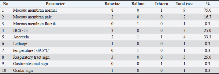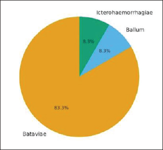 Leptospira infection was dominated by serovar Bataviae (83.34%) with an antibody titer of 1/1,600, Ballum (8.33%) with a titer of 1/100, and Ichterohaemorrhagiae (8.33%) with a titer of 1/1,600, 1/100, and 1/100, respectively. Most cats with leptospirosis were adults (88.33%) and female (66.67%). All cats were domestic or mixed domestic cats with outdoor or semi-outdoor access. Figure 1 shows the distribution of L. interrogans serovars in 12 seropositive catsIn Sleman Regency, Indonesia. Serovar Bataviae predominated (83.3%), followed by the ballum (8.3%) and the ichterohaemorrhagiae (8.3%).
