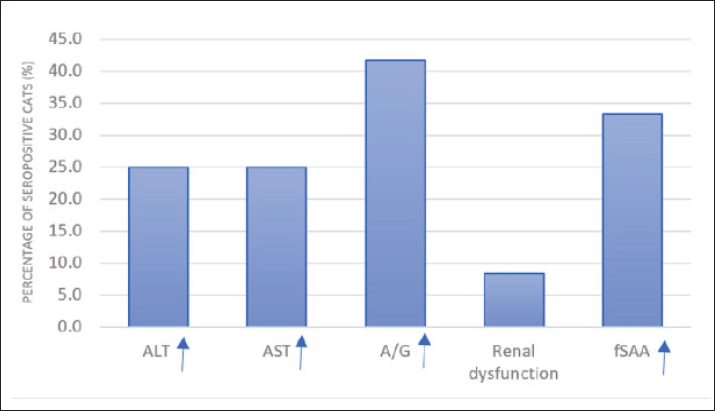 Figure 2 shows the percentage of leptospirosis-seropositive cats (n=12) with abnormalities. In liver and kidney function parameters. Elevated A/G ratio and total BMI were the most frequent (41.7%), while renal dysfunction was the least frequent (8.3%).
