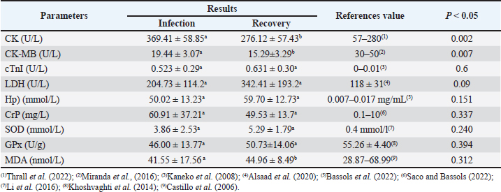 AbstractBackground: Foot-and-mouth disease (FMD) is a highly contagious viral disease in cloven-hoofed animals and remains a significant cause of economic loss in the livestock sector. In addition to causing characteristic clinical symptoms, FMD infection triggers a systemic inflammatory response and oxidative stress that can alter various biochemical and cardiac parameters. However, information on the biochemical and antioxidant profiles of local Indonesian cattle, particularly Madura cattle, remains limited. Aim: This study aimed to evaluate changes in acute phase proteins (APPs), cardiac markers, and antioxidant enzyme activity in Madura cattle naturally infected with FMD and to analyze the relationships between these biochemical parameters during the infection and recovery phases. Methods: Ten 2.5 ± 0.5-year-old male Madura cattle clinically diagnosed with FMD had blood samples taken twice during the infection phase (days 3–7) and the recovery phase (days 28–30). The biochemical parameters analyzed included creatine kinase (CK), CK–myocardial band (CK-MB), lactate dehydrogenase (LDH), cardiac troponin I (cTn-I), haptoglobin (Hp), C-reactive protein (CrP), superoxide dismutase (SOD), glutathione peroxidase (GPx), and malondialdehyde (MDA) using enzyme-linked immunosorbent assay and spectrophotometry methods. Data were analyzed using paired t-tests and Spearman's correlation with a significance level of p < 0.05. Results: There were significant differences (p < 0.05) between the infection and recovery phases in CK and CK-MB parameters, while LDH, Hp, CrP, GPx, MDA, and SOD showed no significant differences. A strong positive correlation was found between CK and CK-MB in the infection phase (r=0.85; p < 0.01), indicating simultaneous damage to skeletal muscle and myocardium. In the recovery phase, there was a positive relationship between Hp and GPx (r=0.80; p < 0.01), indicating recovery of antioxidant function as the inflammatory response decreased. Conclusion: FMD infection in Madura cattle causes physiological changes characterized by increased cardiac biomarkers and APPs and decreased antioxidant enzyme activity. The positive relationship between Hp and GPx reflects the link between the inflammatory process and oxidative stress during recovery. The combination of APP parameters and antioxidant enzymes can be used as biochemical indicators to assess the severity and health status of FMD-infected cattle. Keywords: Acute phase protein, Cardiac marker, Foot-and-mouth disease, Madura, Oxidative stress. IntroductionFoot-and-mouth disease (FMD) is an acute infectious disease that affects cloven-hoofed animals (OIE, 2015). Aphthovirus causes this disease from the Picornaviridae family with seven strains (A, O, C, SAT1, SAT2, SAT3, and Asia 1) that are endemic in various countries around the world, including parts of Asia and most of Africa and the Middle East (Khoshvaghti et al., 2014). This virus is non-enveloped, with a single-stranded RNA genome that is positive-sense, non-segmented, and enclosed in an icosahedral capsid (Eid et al., 2022). This virus spreads rapidly through various direct and indirect contacts and air (Soltani et al., 2020). FMD in cattle is clinically characterized by high fever, loss of appetite, hypersalivation, and vesicles in the interdigital clefts, oral cavity, and mammary glands (Adjid, 2020; Soltani et al., 2020). The transmission of FMD occurs very rapidly, resulting in a high morbidity rate of nearly 100% and a low mortality rate of 5% in adult animals (Mahmoud and Galbat, 2017). Based on the report by Sutawi et al. (2023), FMD in Indonesia in 2022 spread to 19 provinces across 207 districts/cities, with 492,894 infected cattle, 334,838 recovered, and 6,435 dead. This outbreak caused economic losses because most livestock are a source of animal-based food consumption, affecting the balance of animal-based food in Indonesia, such as meat and milk, which ultimately impacts national food security and the farmer's exchange rate (Zainuddin et al., 2023). Techniques for detecting FMD viruses, such as enzyme-linked immunosorbent assay (ELISA), complement fixation test, and reverse transcriptase-polymerase chain reaction, are effective gold standard methods for FMD diagnosis that have been widely reviewed and implemented by various parties (Adjid, 2020). However, blood chemical biomarker tests correlating with FMD disease, such as antioxidant enzyme activity, acute phase proteins (APPs), and musculoskeletal and cardiac functions, have not been widely reviewed (Adjid, 2020). According to Sobhy et al. (2018), using cardiac biomarkers in FMD diagnosis is essential because it relates to myocarditis. Myocarditis caused an increase in cardiac troponin I (cTn-I) and lactate dehydrogenase (LDH) enzyme levels (Soltani et al., 2020). Studies indicate that cTn-I has been used as a diagnostic biomarker because this enzyme is released into the blood immediately after myocardial injury (Sobhy et al., 2018). In addition, research by Soltani et al. (2020) states that other biomarkers that undergo significant changes in the diagnosis of myocardial infarction are the enzymes LDH, creatine kinase myocardial band (CK-MB), and CK. Other important markers to examine, especially in cases of FMD, are haptoglobin and C-reactive protein (CrP). Lee et al. (2003) stated that CrP is a serum APP that responds most rapidly to infection. This protein recognizes phosphocholine on the cytoplasmic membrane of cells, activates the complement cascade, and stimulates macrophages to destroy infectious agents. CrP can regulate the immune system during the early stages of infection. The CrP protein plays a role in destroying infectious agents, minimizing tissue damage, and facilitating tissue repair and regeneration. Viral infections can activate the immune system by causing the release of free radicals such as reactive oxygen species (ROS) and reactive nitrogen species (RNS), which can potentially 