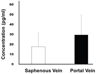 Fig. 1. The concentration of VIP between the portal and saphenous veins. Conflict of interestThe authors declare that there is no conflict of interest. Authors’ contributionsDr. Mitsuhiro Isaka performed the surgery, conceived the study design, and prepared the manuscript. Dr. Hiroshi Ueno performed the surgery with Dr. Isaka and approved the final version. ReferencesBockx, I., Verdrengh, K., Vander Elst, I., van Pelt, J., Nevens, F., Laleman, W. and Cassiman, D. 2012. High-frequency vagus nerve stimulation improves portal hypertension in cirrhotic rats. Gut. 61, 604–612. Corcoran, B.M., Jarvis, S., Hahn, C.N. and Mayhew, I.G. 1999. The distribution of nerve fibers immunoreactive for vasoactive intestinal peptide, calcitonin gene-related peptide, substance P and dopamine β-hydroxylase in the normal equine larynx. Res. Vet. Sci. 67, 251–259. Fahrenkrug, J., Haglund, U., Jodal, M., Lundgren, O., Olbe, L. and de Muckadell, O.B. 1978. Nervous release of vasoactive intestinal polypeptide in the gastrointestinal tract of cats: possible physiological implications. J. Physiol. 284, 291–305. Hellstrand, P., Fahrenkrug, J., Uddman, R. and Järhult, J. 1985. Role of vasoactive intestinal polypeptide (VIP) in the neurogenic vasodilatation of the portal vein in the rabbit. Regul. Pept. 12, 309–316. Johnson, T.J., Quigley, E.M., Shaffer, C.J., Adrian, T.E. and Rikkers, L.F. 1994. Effects of portal vein stenosis and superior mesenteric vein ligation on mesenteric venous pressure and porta-systemic shunting in the rat. J. Invest. Surg. 7, 477–483. Kilpatrick, S., Gow, A.G., Foale, R.D., Tappin, S.W., Carruthers, H., Reed, N., Yool, D.A., Woods, S., Marques, A.I., Jalan, R. and Mellanby, R.J. 2014. Plasma cytokine concentrations in dogs with a congenital portosystemic shunt. Vet. J. 200, 197–199. McMichael, J. 1937. The oxygen supply of the liver. Exp. Physiol.127, 73–87. Tivers, M.S., Handel, I., Gow, A.G., Lipscomb, V.J., Jalan, R. and Mellanby, R.J. 2015a. Attenuation of congenital portosystemic shunt reduces inflammation in dogs. PLoS One. 10, e0117557. Tivers, M.S., Lipscomb, V.J., Smith, K.C., Wheeler-Jones, C.P. and House, A.K. 2015b. Lipopolysaccharide and toll-like receptor 4 in dogs with congenital portosystemic shunts. Vet. J. 206, 404–413. Vollmar, B. and Menger, M.D. 2009. The hepatic microcirculation: mechanistic contributions and therapeutic target in liver injury and repair. Physiol. Rev. 89, 1279–1339. Yasui, A., Naruse, S., Yanaihara, C., Ozaki, T., Hoshino, M., Mochizuki, T., Daniel, E.E. and Yanaihara, N. 1987. Corelease of PHI and VIP by vagal stimulation in the dog. Am. J. Physiol. 253, 13–19. | ||