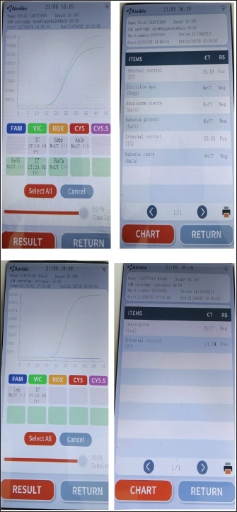Fig. 1. Commercial test kit showing positive results for Leptospira sp. and serum biochemistry result strip at day 3. By September 12 (day 4), dexamethasone was discontinued and replaced with tolfenamic acid. The treatment remained the same for the next 4 days. By September 14 (day 6), clindamycin administration was stopped. By September 17 (day 9), all medications were continued except for metoclopramide. Enalapril and amlodipine were also given on this day. By September 18 (day 10), the patient was gradually weaned off most medications, receiving only oral doxycycline, liver and anti-anemia supplements, and injectable omeprazole, procaine, and benzathine penicillin. The same medications were given the next day, September 19 (day 11), with the addition of enalapril and amlodipine. The owner opted for additional tests. On September 20 (day 12), blood samples were obtained from the patient and sent to another veterinary clinic (GPY Veterinare Animale, Cebu City, Philippines) for PCR testing. The in-clinic PCR test (AimBio) revealed negative results for Ehrlichia canis, Anaplasma platys, Babesia canis, Babesia gibsoni, Mycoplasma haemocanis, and Hepatozoon sp. (Fig. 2) but positive for Rickettsia sp. (Fig. 3). Another fraction of the blood sample was further processed for DNA extraction and tested using standard PCR utilizing the gltA gene (Satoh et al., 2002) at the Institute for Molecular Genetics, Parasitology, and Vector-borne Diseases, Cebu Technological University, Cebu City, Philippines. Sequencing or species-level identification was not performed. PCR results revealed a positive band at the expected length (341 BP) (Fig. 4). A positive control was not included in the standard PCR run because Rickettsia DNA was unavailable at the local laboratory, which is a limitation of the test. However, the clear amplification of a band of appropriate size (341 bp) for the gltA gene is robust, supportive evidence. Contamination was also ruled out, as the negative control remained negative.