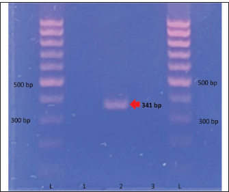 Fig. 4. Standard PCR gel showing a positive band for Rickettsia sp. (341 bp) (L=Ladder/Ladder, 1=Negative Control 1, 2=Patient Sample, 3=Negative Control 2). The patient was discharged on September 21, 2025 (Day 13). With the new findings, doxycycline, furosemide, a multiple-organ supplement (Organumshield), an anti-anemia supplement (Hemashield), and a Carica papaya-based supplement (Thrombocure) were prescribed for an additional three weeks. By October 12, 2025 (Day 42), the patient was re-evaluated. CBC showed normal platelet counts, but anemia persisted. The serum biochemical profile also showed normal values, indicating recovery from liver damage. After completing the prescribed medications, only the multiple-organ supplement and anti-anemia supplement were continued, with the addition of an immune supplement (Immunopetshield) (Table 3). By December 14, 2025 (Day 105) (Fig. 5), the patient was retested for Rickettsia sp. using the same in-clinic PCR for post-treatment evaluation. The results showed negative results. By December 23, 2025 (Day 114), CBC results showed a normal total white blood cell count, with no anemia or thrombocytopenia observed.