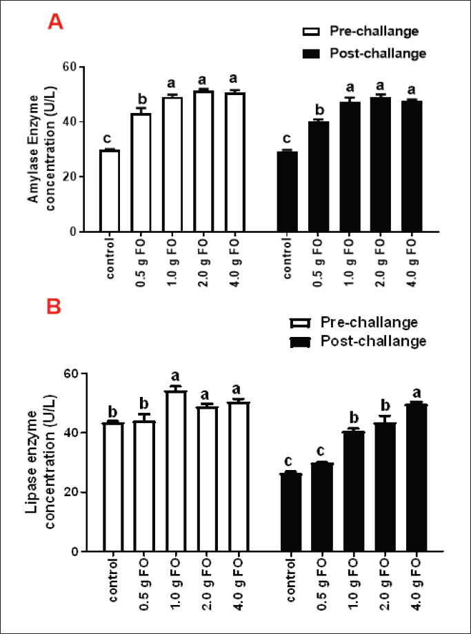 Fig. 1. Amylase and lipase enzyme concentrations following fenugreek oil dietary enrichment at 0.0, 0.5, 1.0, 2.0, and 4.0 g/kg diet under normal and post-A. hydrophila challenge. Results are expressed as means ± SE and different letters indicate statistical significances at p < 0.05. The lipase enzyme activity (Fig. 1B) demonstrated a variable pattern among different groups. The highest lipase activity was measured in the 1.0-g FO/kg diet compared with the control (P < 0.05). Following A. hydrophila infection, lipase enzyme activity did not differ from that under normal culturing conditions (P > 0.05). Histopathological features of the intestine, hepatopancreas, and spleen of Nile tilapia fingerlings in response to FO-dietary supplementation under normal and A. hydrophila infection conditionsUnder normal culturing conditions (before the A. hydrophila challenge)The histological structure of the intestine of all experimental groups did not show any deviation from the normal histological structure; intestinal villi lined by simple columnar epithelium with goblet cells rested on lamina propria of loose connective tissue and lamina muscularis bounded externally with serosal covering (Fig. 2). The morphometric analysis of data obtained from measurement of intestinal villi (Table 6) revealed marked increases in villi length, surface area, and villi length/crypt depth in a dose-dependent manner, especially in the fenugreek oil-containing groups at 2.0 and 4.0 g/kg diet compared with fenugreek oil at 0.5 and 1.0 g. The histological structure of the hepatopancreas of all groups revealed the presence of macrosteatosis in a dose-dependent pattern in all FO-treated groups compared with the non-supplemented group (0.0 g FO/kg diet) (Fig. 3). The microscopic structure of the splenic parenchyma revealed the presence of interconnected cords of red and white pulp in addition to melanomacrophage centers with no evidence of pathological changes (Fig. 4).