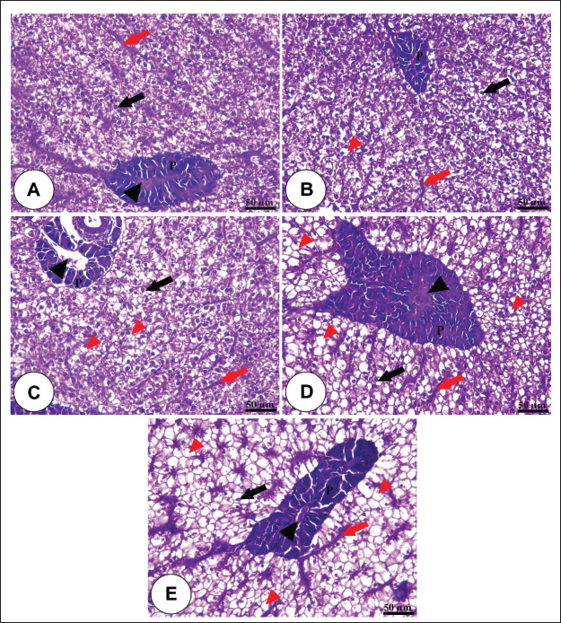 Fig. 3. Photomicrograph of the H&E-stained panel of the hepatopancreas of the fenugreek oil-enriched groups at 0 g (A), 0.5 g (B), 1.0 g (C), 2.0 g (D), and 4.0 g (E) showing polyhedral-shaped hepatocytes (black arrows), hepatic sinusoids (red arrows), pancreatic acini (P), and pancreatic blood vessels (black arrow heads) in addition to the presence of microsteatosis (red arrows) in the fenugreek oil-containing groups.