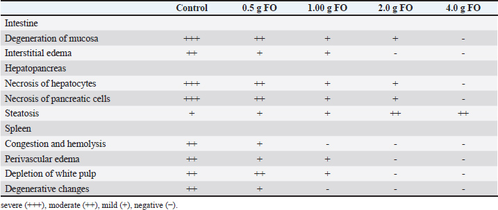 Postchallenge infection with A. hydrophilaThe microscopic structure of the intestinal villi of the control group (0.0 g fenugreek oil/kg diet) and those challenged with A. hydrophila revealed severe degenerative effects of the epithelial lining along the entire length of the villi, with exposure of the lamina propria and interstitial edema, in addition to the accumulation of necrotic epithelial cells inside the intestinal lumen. These harmful effects were diminished with dietary enrichment with different fenugreek oil concentrations, especially at higher concentrations (Fig. 5).