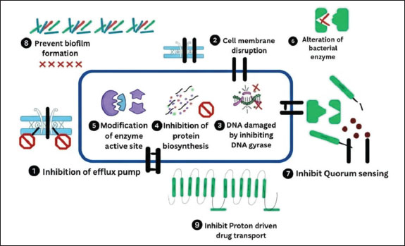 According to a study by Ali et al. (2022), EGEO may be an alternate therapeutic option for the treatment of MRSA infections. Rasheed et al. (2024) suggested that some fruit juices, Citrus reticulate and Punica granatum, have anti-MRSA properties. The antibacterial mechanisms of these phytochemicals are visually summarized in Figure 2.