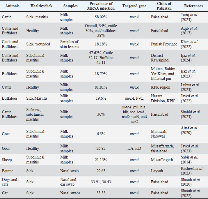 AbstractMethicillin-resistant Staphylococcus aureus (MRSA) is a significant public health concern because of its zoonotic potential and multidrug resistance. This review provides a comprehensive overview of the prevalence of MRSA in livestock and companion animals in Pakistan, emphasizing its molecular epidemiology and resistance mechanisms. MRSA has been detected in bovine mastitis, raw milk, meat, and companion animals, with alarming rates across species and regions. Risk factors include poor hygiene, inappropriate antibiotic use, and close human-animal interactions, all of which contribute to its spread at the animal-human-environment interface. Advanced diagnostic tools such as polymerase chain reaction and chromogenic media tests have facilitated rapid and accurate MRSA detection. The review also highlights alternative treatment strategies, including the use of medicinal plants, bacteriophage therapy, nanoparticles, and probiotics, as promising options to combat MRSA infections. Implementation of stringent hygiene measures, prudent antibiotic use, and further research into vaccines are critical for controlling MRSA in animals and safeguarding public health. Keywords: Methicillin-resistant Staphylococcus aureus, One Health, Antimicrobial resistance, Probiotic therapy, Public health. IntroductionStaphylococcus aureus (MRSA) is an opportunistic pathogen that inhabits the skin, mucosal membranes, and upper respiratory tracts of both animals and humans (Feng et al., 2008). In veterinary medicine, it is the leading causative agent of bovine mastitis in dairy cattle (Khairullah et al., 2022), resulting in huge economic losses worldwide (Li et al., 2018). Currently, most S. aureus strains classified as methicillin-resistant S. aureus (MRSA) exhibit resistance to penicillin derivatives (Grema et al., 2015). MRSA was first detected in the United Kingdom in 1961 (Khanal et al., 2022). The mecA gene, which encodes penicillin-binding protein 2a (PBP2a), is the gold standard for detecting MRSA (Javed, 2021). Since 1972, when MRSA was first isolated from bovine mastitis cases in dairy cattle in Belgium, multiple studies have verified the zoonotic transmission of MRSA from livestock to humans; after that, it was also recognized as livestock-associated MRSA (Khairullah et al., 2020). The World Health Organization (WHO) has classified methicillin-resistant MRSA as a "High Priority" pathogen on its Global Priority List of Antibiotic-Resistant Bacteria, underscoring the critical need for research and development of new therapeutics (Shrestha et al., 2021). MRSA has several virulence factors, including coa, spa, and Panton-Valentine leucocidin (pvl) genes (Sadiq et al., 2020). The pvl gene encodes the most potent staphylococcal leukotoxin, which can inhibit bovine neutrophils, destroy polymorphonuclear cells, and increase host resistance and pathogenicity (Shahid et al., 2023). The mecA gene in the chromosomal cassette of foreign DNA sections encodes the PBP2a protein, the primary mode of MRSA transmission (Ijaz et al., 2024). Enzymes such as proteases, lipases, elastases, and slime factors help host tissues grow and propagate to new sites (Gordon and Lowry, 2008). Until the mid-1940s, penicillin was referred to as the most effective antibiotic against many staphylococcal infections; not long after that, S. aureus strains started developing resistance to penicillin (Khan et al., 2014) and beta-lactamase enzyme production. The emergence of methicillin resistance, as depicted by the acquisition of the mecA gene, has led to a low affinity of bacteria for all β lactam drugs (Hamid et al., 2017). Furthermore, studies have detected MRSA in bovine mastitis (Imran et al., 2023), raw milk (Effendi and Harijani, 2017; Effendi et al., 2019), commercial raw meat, including chicken, beef, and mutton (Sadiq et al., 2020), and dairy farms (Tyasningsih et al., 2019; Khairullah et al., 2022; Imran et al., 2023). MRSA prevalence in animals is reported to be higher in many Asian countries compared to other continents, a trend often attributed to factors such as high-density livestock farming, variable antimicrobial stewardship practices, and the intensive use of antibiotics in animal production (Zaatout and Hezil, 2022), as well as their use in companion animals (Khairullah et al., 2023a). The polymerase chain reaction (PCR) is the "gold standard" for rapid and accurate screening tests for MRSA detection by identifying the mecA gene (Ijaz et al., 2023). The uncontrolled use of antibiotics in human and veterinary medicine is a significant contributor to the emergence and spread of MRSA infections, which limits therapeutic options (Khairullah et al., 2023b). The rise of AMR has increased the need for research into alternative antibiotics or treatment strategies (Jenkins et al., 2015). This review article aims to describe the molecular prevalence of MRSA in livestock and companion animals in Pakistan, developments in rapid diagnosis, and the exploration of various treatment options. Molecular prevalence of MRSA in animals in PakistanMRSA infection in large ruminants (cattle and buffaloes)There is still a paucity of information on studies in Pakistan that investigate the prevalence of MRSA in food-producing animals and their by-products. In fact, for some animals, data on MRSA investigation is nonexistent, especially with regard to pork meat from pigs, due to religious reasons, as it is considered a “taboo food” for Muslims. MRSA is considered as a contagious pathogen as it can cause subclinical and clinical mastitis in cattle and buffaloes. Interestingly, dairy farms have been reported to be important sources of MRSA spread, which have been linked to epidemics in both humans and animals (Tariq et al., 2023; Ijaz et al., 2023; Ijaz et al., 2024). A study was conducted in several Tehsils of Faisalabad District to determine the prevalence of MRSA in bovine milk. In this study, the prevalence of MRSA in cow and buffalo milk