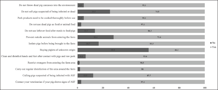 Farmers’ knowledge of ASF information and ASF prevention practicesFigures 1 and 2 show that most farmers have general knowledge about ASF. Most farmers have been trained and understand that ASF is caused by a virus that mainly infects pigs and has serious economic effects. However, some still have certain misconceptions, for instance, that people cannot be a host of a disease. A deep understanding of the risk posed by ASF concerning the possibility that it may kill pigs and the fact that the virus can stay in an area for years is, however, relatively high. At the same time, a strong consensus exists on the crucial role of biosecurity measures and ensuring that pork has clear quarantine origins to prevent the spread of the disease. The results show that pig farmers are well-prepared regarding ASF knowledge. The results in Figure 3 show that farmers are highly aware of ASF prevention and control. Most farmers are willing to contact veterinarians and take safety measures, such as regular disinfection and restricting access by strangers to the farm. However, some shortcomings remain in prevention practices, especially the purchase of unknown piglets from unknown sources and the lack of widespread quarantine of newly imported pigs/piglets. This can increase the risk of spreading the infectious disease. Another problem is that a few farmers still sell pigs suspected of being sick or dead, thereby increasing the risk of spreading the disease to the environment. Notably, most farmers have implemented effective biosecurity measures, such as not using leftover food or dead pigs as animal feed and being aware of the proper disposal of dead pigs. However, raising awareness of the origin of piglets and quarantine still needs to be promoted through training and biosecurity practice programs.
