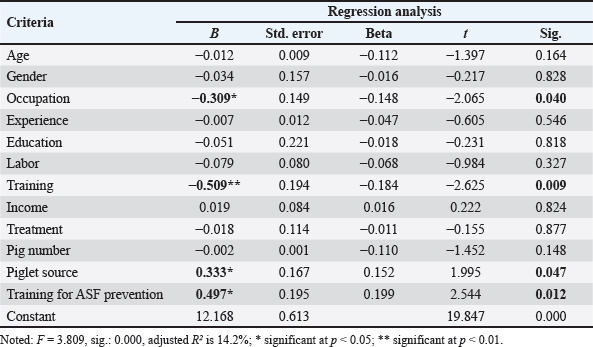 Y=12.168 + (−0.309) × occupation + (−0.509) ×training + 0.333 × piglet source + 0.497× training for ASF prevention. Effect of social profiles on farmers’ knowledge of ASF prevention practicesThe regression analysis results in Table 3 show that some social profile factors significantly influence the ability of farming households to prevent ASF. Main occupation has a negative impact on the ability to prevent the disease (B=−1.437, p < 0.001); farmers who only focus on pig farming may limit the ability to apply ASF prevention measures. Training also has a significant negative impact (B=−1.009, p < 0.001). In contrast, income, treatment method, number of pigs raised, and pig breed origin all had positive and significant effects (B=0.460, p < 0.001; 2B=0.338, p=0.029; B=0.004, p=0.023; and B=0.595, p=0.009), indicating that those who applied appropriate treatments, raised more pigs, or produced their pig breeds had better disease prevention. Participation in ASF prevention training also had a significant positive effect (B=0.872, p=0.001), confirming the importance of training in improving disease prevention. Age, gender, experience, and number of workers did not significantly affect the prevention of ASF. The form of the framework could be as follows: Table 3. Influence on the ability to prevent ASF in farms.