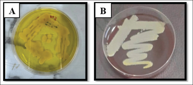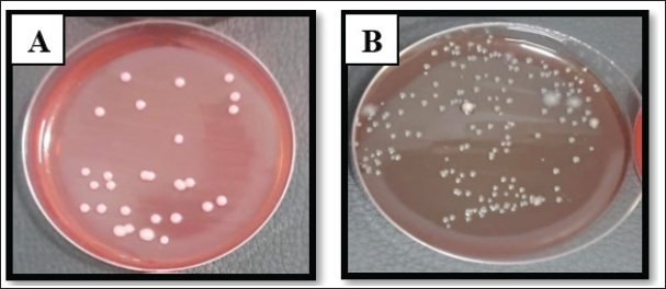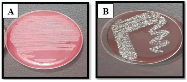 Fig. 4. Klebsiella pneumoniae on A. MacConkey Agar. B. Blood agar. Identification of VITEK-2 systemS. aureus was the most abundant organism among all 125 isolates (52.8% of total) identified by the automated system, and the most abundant pathogens were found in accidental (66.66%) and postoperative (59.37%) wounds. Klebsiella pneumoniae and E. coli were in second place at 25.6% and 21.6%, respectively, with various distributions among the types of wounds, further supporting the clinical observation that Gram-positive cocci were the most common etiological agents in this population. The grouped matrix across the types of wounds highlighted the difference between risks in each setting: S. aureus was most frequently isolated from accidental and surgical wounds, whereas E. coli was more common in local anal wounds. These findings helped shape the subsequent in vivo work, in which S. aureus confirmed as VITEK resistant, was used to model infected wound healing under the trial therapies (Table 3). Table 3. Bacterial isolates derived from different wound types were subjected to identification test using the VITEK® 2 system.