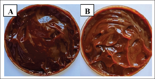 Fig. 5. Physical appearance of A. GF 6%. B. GF 12%. Plant polyphenols (HPLC)The HPLC data corroborated the presence of a diverse range of polyphenols and flavonoids, such as rutin, ellagic acid, gallic acid, quercetin, ferulic acid, hydroxybenzoic acid, catechin, p-coumaric acid, and kaempferol, in the extracts. The high concentrations of gallic acid in the three botanicals (pomegranate, 165.9 ppm; rosemary, 102.6 ppm; and pumpkin, 95.8 ppm) and the high signals of ferulic acid and rutin justify the antioxidant and wound-modulatory properties of the gel. The variation in specific peaks between the plants illustrates the targeting of specific phenolic classes with solvent polarity, with rosemary and pumpkin having relatively higher quercetin/rutin signals and pomegranate being more ellagic/gallic rich. This composite fingerprint (Table 4) provides a biochemical basis for the multimodal actions observed in vivo. Table 4. Polyphenol analysis of plant extracts by HPLC.