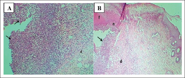Fig. 7. (A) Section of the skin (infected group) shows: severe skin abscess with superficial fibrin clot formation (f), necrotic tissue (n), pus cells (black arrow), and dermatitis (d). H&E stain. (B) Section of skin (infected group) shows: severe skin abscess with thick layer of pus cells (arrows), necrotic tissue, and dermatitis (d). H&E stain.100×.
