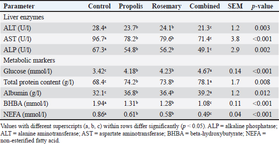 Liver function and metabolic parametersEvaluation of liver function parameters revealed that both supplements exert strong protective effects against pregnancy-induced hepatic stress. Liver enzyme activities (ALT, AST, and ALP) were significantly lower in all treatment groups, suggesting better hepatic health and less cellular damage (Table 4). Table 4. Effects of propolis and rosemary extract supplementation on liver function parameters in late-pregnancy Awassi sheep.