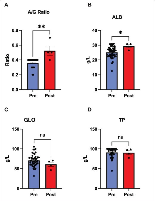 Fig. 1. Changes in serum protein markers before and after treatment with remdesivir for 60 days. Comparison of (A) albumin/globulin (A/G) ratio, (B) albumin, (C) globulin, and (D) total protein. Both the A/G ratio and albumin levels significantly increased (p < 0.01 and p < 0.05, respectively), reflecting normalization of protein homeostasis. Globulin and total protein levels remained unchanged. Data are presented as mean ±SEM. (*p < 0.05, **p < 0.01, ns=not significant). No hepatotoxicity or significant hepatic recovery occurred within 60 days after remdesivir administration, with largely stable liver parameters. No significant changes were observed in ALT, AST, GGT, or bilirubin levels before and after treatment (p > 0.05). The ALT/AST ratio also remained unchanged. Only a few cats developed mild elevation of baseline bilirubin levels; no overt cases of jaundice were noted (Fig. 2).