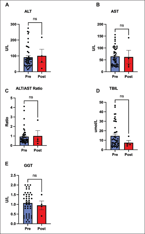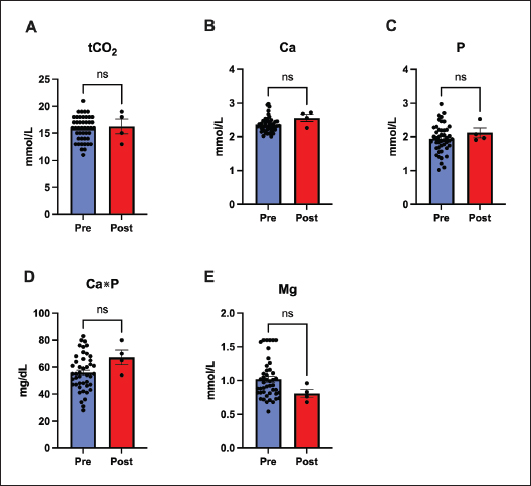 Fig. 2. Assessment of hepatic function markers before and after treatment with remdesivir for 60 days. Key hepatic markers remained stable, supporting the safety of remdesivir treatment. Panels show (A) ALT, (B) AST, (C) ALT/AST ratio, (D) total bilirubin (TBIL), and (E) gamma-glutamyl transferase (GGT), none of which changed significantly. Data represent mean ± SEM. (ns=not significant). Systemic electrolyte and mineral concentrations did not show any evidence of metabolic or organ-related disturbances and remained within the referent ranges throughout the treatment. The values for Carbon Dioxide, calcium, phosphorus, magnesium, and the calculated Ca×P product before and after treatment did not differ significantly (p > 0.05 for all comparisons) (Fig. 3).