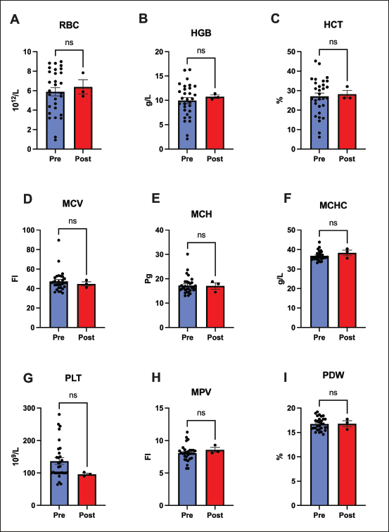 Fig. 6. Erythrocyte and platelet parameters stability after 60 days of remdesivir. No significant alterations were found in (A) red blood cell (RBC) count, (B) hemoglobin (HGB), (C) hematocrit (HCT), (D-F) red cell indices (MCV, MCH, and MCHC), (G) platelet (PLT) count, or (H-I) platelet indices (MPV and PDW). Data represent mean ± SEM. (ns=not significant). DiscussionIn this study, the clinicopathological responses of FIP-affected cats following 60 days of antiviral therapy were evaluated, with a particular focus on the diagnostic and prognostic utility of the A/G ratio. Our cohort included cats, aged 3–24 months. This age range is consistent with established FIP epidemiology, which shows that the disease primarily affects cats aged 2 years (Thayer et al., 2022; Murphy et al., 2024). While some studies have suggested a higher risk of FIP in male felines (Pesteanu-Somogyi et al., 2006; Gaonkar et al., 2019), our study enrolled a relatively balanced group (21 males vs. 25 females). All cats exhibited FIP-related clinical signs, including persistent fever, weight loss, lethargy, and abdominal distension in effusive cases. These consistent demographics and clinical signs confirm that our study cohort is representative of typical, naturally occurring FIP cases seen in veterinary practice (Abbas, et al., 2014; Hamin, 2023). The most striking observation in our study was the dramatic improvement in the A/G ratio within 60 days following remdesivir therapy. Most of the cats enrolled in this study initially presented with A/G ratios close to or below 0.4, an indicator of active FIP due to hypoalbuminemia and hyperglobulinemia (Nururrozi, et al., 2022; Moyadee, et al., 2024). After therapy, however, most cats had an A/G ratio greater than 0.6–0.8, indicating normalization of their serum protein balance. This shift was the result of two changes: first, a remarkable increase in albumin. Albumin is a negative acute-phase reactant, and its rebound suggests decreased systemic inflammation and enhanced hepatic protein synthesis (Barle, et al., 2006). Second, globulins remained stable or slightly decreased. In FIP, high globulin levels are a consequence of chronic antigenic stimulation (Goitsuka et al., 1990; Kipar and Meli, 2014); therefore, its stabilization indicates decreased immune activation after viral replication control. Thus, the rise in the A/G ratio appears to be an undisputed hallmark of both clinical and immunological recovery, further supporting its utility as an inexpensive and informative biomarker of therapeutic response. Although protein parameters improved, hepatic markers such as ALT, AST, and bilirubin did not change. This stability of liver values has two major implications. First, from the standpoint of disease, it suggests that there was neither significant deterioration nor marked recovery in hepatic function over the 60-day period. FIP-related liver enzyme abnormalities are usually mild unless granulomatous lesions are directly present within the liver (Attipa, et al., 2023). Hyperbilirubinemia without high ALT may occur in FIP, possibly due to cytokine-mediated cholestasis independent of direct liver cell damage (Tsai et al., 2011; Torres et al., 2024). The stability of bilirubin in our cohort could indicate that the cats either did not have significant cholestasis at baseline or that it takes longer than 60 days to resolve. Second, the liver panel stability strongly supports the safety of remdesivir and indicates that it is not notably hepatotoxic in cats at this dosage. These results indicate that liver function was mild at the start of treatment and that continuous therapy did not worsen or resolve hepatobiliary activity during the 60-day period. Even in the absence of significant ALT elevations, hyperbilirubinemia is commonly seen in 20%–60% of the effusive form of FIP cases. The lack of significant change in bilirubin or hepatic enzyme alteration supports the view that remdesivir does not exhibit adverse action on liver function, consistent with prior safety evaluations (Force et al., 2023). This finding is particularly significant, given that remdesivir is known to elevate liver enzymes in other species, including humans (Kaka and Wilt, 2022). Our data align with other large field studies in cats, which have found that the hepatic side effects of remdesivir are rare (Rasmussen et al., 2022; Coggins et al., 2023). Furthermore, a number of metabolic and renal markers did not show any significant changes, but the ratio of creatinine-BUN showed a significant change, which represents a significant improvement in the renal protein handling in the cats following remedsivir therapy (Maharani et al., 2025). The most critical immunological finding was the significant rebound of lymphocyte counts (Dascalu, et al., 2024). FIP characteristically results in T-cell depletion and lymphopenia (Knotek et al., 2000; Vermeulen et al., 2013), suggesting a restitution of immune competence. We attribute this to reduced viral replication and the subsequent decrease in systemic inflammation (Mustaffa-Kamal et al., 2019). Our observation is consistent with other reports that equate lymphocyte recovery with clinical remission, positioning adaptive immunity restoration as a vital marker of therapeutic success (Addie, et al., 2022; Tršar, et al., 2019). No significant changes in erythrocyte parameters were observed following the treatment regimen. This lack of fluctuation is consistent with the type of anemia associated with FIP (Olson and Hohenhaus, 2019). Chronic anemia results from cytokine-mediated suppression of erythropoiesis and impaired iron metabolism; resolution typically occurs only after full remission and reduction of systemic inflammation (Chikazawa and Dunning, 2016; Ottenjann et al., 2006). The persistence of mild anemia in some cats likely reflects ongoing recovery or the short monitoring interval, as hematologic normalization may require several months post-therapy (Čern
