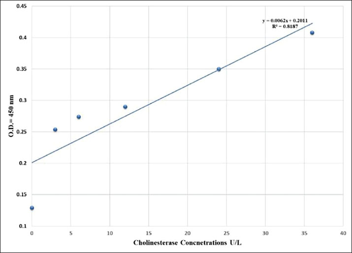 AbstractBackground: Neurological health is a relevant area of animal public health, as perturbations in the activity of neural enzymes have a tendency to mirror animal welfare and environmental stress that will ultimately affect human populations. Aim: The aim was to measure serum cholinesterase (ChE) activity in different animal species using a 96-well Enzyme-Linked Immunosorbent Assay (ELISA) assay, with an emphasis on its application as a biomarker of animal welfare within the frame of public health. Methods: A linear calibration curve (y=0.0062x + 0.2011, R²=0.8187) with nice linearity was achieved, and validated the assay to be trustworthy for quantitative enzyme assay. Nine groups of animal serum samples, including rabbit, sheep, cow, fish, cat, chicken, rat, dog, and goat, were collected and assayed to determine variation in ChE levels. Results: The findings demonstrated distinct interspecies variations, revealing the highest mean enzyme activity in chickens (6.99 U/l), followed by cats and fish, and the lowest in sheep, goats, and dogs (1.6–1.7 U/l). The results show that the activity of ChE is directly related to the physiological status of animals and may be a highly sensitive biochemical parameter for measuring animal welfare and neurophysiological homeostasis. There could be reduced activity of ChE could be indicative of exposure to neurotoxic chemicals, stress, or starvation, while consistent activity would indicate health and environmental stability. Conclusion: From the public health point of view, the study highlights the importance of monitoring ChE activity as being integral to welfare monitoring and environmental watch programs. The ELISA-based assay was shown to be a high-throughput, robust method for determining neurological and welfare status in animals, reaffirming its usefulness under the One Health umbrella that links animal and human well-being. Keywords: Animal public health, Cholinesterase levels, ELISA. IntroductionNeurological health of domestic and wildlife animals is essential in ecological balance, productivity, and welfare (Beaulieu, 2024). Among all biomarkers used in ascertaining neurological health, cholinesterase (ChE) enzymes, and particularly acetylcholinesterase (AChE) and butyrylcholinesterase (BChE), have generated enormous interest as sensitive markers of neurotoxic chemicals and as playing a fundamental role in synaptic transmission (Santarpia et al., 2013). ChEs catalyze the hydrolysis of the neurotransmitter acetylcholine to choline and acetate, a reaction that is essential to the termination of nerve impulses in cholinergic synapses (Tougu, 2001). Any alteration in their activity, whether through genetic, physiological, or toxicological mechanisms, can lead to profound disruptions of neuromuscular function and mental capacity (Siciliano et al., 2020). Consequently, measurement of ChE levels provides an extremely sensitive indicator of animal population neurological health and environmental exposure history (Lionetto et al., 2013). In the past decades, exposure to neurotoxic chemicals, including organophosphates, carbamates, heavy metals, and certain natural toxins, has been identified as a main cause of ChE inhibition (Colovic et al., 2013). Ecological monitoring studies increasingly employed ChE activity as a neurotoxicity biomarker for estimating ecosystem health, occupational hazard, and pesticide contamination (Chambers et al., 2002). Despite its long-standing diagnostic application, however, comparative measurements of ChE activity across different animal phyla are few (Jiang et al., 2022). Interspecies comparison can illustrate evolutionary adaptations in neurophysiology and reveal species that are atypically vulnerable to neurotoxic stressors (Spurgeon et al., 2020). A very valuable and potent instrument for immunodiagnosis, with which to identify biomolecules of high specificity and sensitivity, is the Enzyme-Linked Immunosorbent Assay (ELISA) (Kondo et al., 1995). ELISA is thus highly suited for large-scale comparative studies across animal species. The knowledge of baseline and variant profiles of ChE activity in animal species serves multiple purposes. It enables us to establish reference ranges that are needed for the interpretation of deviations occurring due to disease, aging, or exposure to xenobiotics (Nunes, 2011). Second, comparisons across species can uncover differences in functional and ecological responses—e.g., herbivorous versus carnivorous versus omnivorous species, or aquatic versus terrestrial species—that are a manifestation of their respective evolved strategies of neural modulation and detoxification (Pezzementi et al., 2011). Third, these findings are of translational relevance to human health because, in most cases, animals serve as sentinels for environmental neurotoxicity, mirroring exposures that may, in the long run, affect human populations within the same environment. AChE in mammals is located mainly in neural and muscle tissue, while BChE occurs in tremendous quantity in plasma and liver as a reserve scavenger enzyme (Ord and Thompson, 1950). In birds, both the localization and activity of these enzymes are highly variable with respect to migratory pattern and dietary exposure to agrochemicals (Layer, 1983). Amphibians and reptiles, which primarily occupy contaminated aquatic environments, possess high ChE sensitivity and are valuable bioindicators of pesticide pollution. Fish species, too, have been extensively studied for water pollutant ChE response because enzyme activity changes mirrored behavioral and reproductive impairment (Khan and Law, 2005). However, complexity in interspecies variation demands standardized procedures such as ELISA for credible cross-taxonomic comparison to be possible. Outside of toxicological measurement, the ChE enzymes play roles in larger processes of neurological health and disease (Ballard et al., 2005). Changed levels of AChE and BChE in humans and in animal 