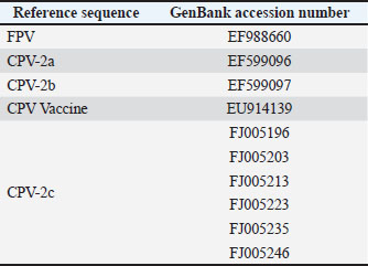 AbstractBackground: Canine parvovirus type 2 (CPV-2) remains a major cause of morbidity and mortality in young dogs. Clinical and molecular data obtained between 2003 and 2014 from a veterinary teaching hospital in central Spain were analyzed to characterize circulating CPV-2 antigenic variants and associated in-hospital outcomes. As the samples were collected more than a decade ago, the reported frequencies represent historical CPV-2 data rather than the current circulation. Aim: This study aimed to describe the historical distribution of CPV-2 antigenic variants (2a, 2b, and 2c) detected in hospital-presenting clinical samples collected between 2003 and 2014, document rare detections of feline panleukopenia virus (FPV) and the Cornell vaccine strain, and analyze clinical variables associated with in-hospital mortality. Methods: A retrospective series of 110 clinical samples were analysed using rapid antigen tests and polymerase chain reaction. Adequate amplification yielded 583-bp VP2 fragments, of which 50 were selected for sequencing (42 produced high-quality reads). Species identification (CPV-2 vs. FPV) was based on full-length amplicon alignment and phylogenetic clustering. Amino acid residue 426 was used as a supporting marker to distinguish the CPV-2a, CPV-2b, and CPV-2c antigenic variants. Logistic regression models estimated odds ratios (OR) with 95% confidence intervals (CI). Results: In the sequenced archival cases, CPV-2c was the predominant variant (42.9%, 18/42), followed by CPV-2a (31.0%, 13/42), the Cornell vaccine strain (11.9%, 5/42), CPV-2b (9.5%, 4/42), and FPV (4.8%, 2/42). Small-breed dogs (<15 kg) exhibited higher odds of in-hospital death (OR=2.74; 95% CI=1.18–6.37). Dogs presenting with gastrointestinal signs in combination with neurological and/or respiratory signs had markedly increased odds of mortality (OR=9.14; 95% CI=2.29–36.40). No statistically significant associations were observed between mortality and antigenic variant or vaccination status. Conclusion: This archival cohort provides a historical reference for CPV epidemiology in central Spain. CPV-2c was the most common variant. Breed size and multisystemic involvement were significantly associated with in-hospital mortality. However, contemporary sequencing would be necessary to monitor the evolution of CPV-2 beyond the study period due to the historical nature of the study. Keywords: Canine parvovirus, Clinical epidemiology, Hospital mortality, Antigenic variation, VP2. IntroductionCanine parvovirus type 2 (CPV-2) is a highly contagious enteric virus that induces considerable morbidity and mortality, particularly among unvaccinated puppies and juvenile dogs worldwide (Mazzaferro, 2020). CPV-2 is classified within the family Parvoviridae, subfamily Parvovirinae, and genus Protoparvovirus, under the species Carnivore protoparvovirus 1, which also includes feline panleukopenia virus (FPV), in accordance with ICTV taxonomy. Both CPV-2 and FPV exhibit a broad host range, with documented natural infections in domestic cats (Felis catus), raccoons (Procyon lotor), raccoon dogs (Nyctereutes procyonoides), minks (Neogale vison), and foxes (Vulpes vulpes) (Allison et al., 2016; Shackelton et al., 2005). Clinical manifestations of CPV-2 infection primarily affect puppies and typically include severe gastroenteritis, characterized by vomiting and diarrhea, as well as myocarditis and myocardial fibrosis (Ford et al., 2017; Mazzaferro, 2020). The CPV-2 genome comprises approximately 5.2 kilobases (kb) of single-stranded DNA, encoding two nonstructural proteins (NS1 and NS2) and two structural proteins (VP1 and VP2) (Reed et al., 1988). VP2, the major capsid protein, influences the host range and contains major antigenic epitopes targeted by neutralizing antibodies (Parrish, 1999). The virus is noted for rapid evolution (approximately 10⁻⁴ substitutions per site per year), particularly in VP2, supporting the continued emergence of antigenic variants (Cotmore et al., 2014). CPV-2 was first identified in canines in the late 1970s, causing acute and frequently fatal disease (Appel et al., 1979). Thereafter, several antigenic variants replaced the original virus. CPV-2a, which can infect both dogs and cats, emerged following mutations in VP2 (L87M, I101T, A300G, D305Y) (Buonavoglia et al., 2001; Allison et al., 2016). CPV-2b, first detected in the United States in 1984 and distinguished by N426D, co-circulates with CPV-2a with region-specific prevalence (Parrish, 1999; Zhou et al., 2017; Kwan et al., 2021). CPV-2c, characterized by D426E, was initially reported in Italy in 2000 (Buonavoglia et al., 2001) and subsequently disseminated globally (Decaro et al., 2007). Although initially considered less pathogenic (Decaro et al., 2005), CPV-2c causes severe, frequently fatal hemorrhagic enteritis, including in vaccinated adult dogs (Decaro et al., 2008). Subsequently, CPV-2a and CPV-2b variants emerged, differing from earlier forms by a single VP2 amino acid substitution (S297A) (Ohshima et al., 2008; Mukhopadhyay et al., 2014; Chen et al., 2019). Most studies indicate that current vaccines provide broad cross-protection against circulating variants despite the emergence of CPV-2 antigenic variants (Wilson et al., 2014; Packianathan et al., 2022). The emergence and distribution of CPV-2 have been documented in a small number of studies in Spain (Calatayud et al., 2020; de Ybañez et al., 1995; Decaro et al., 2006). The earliest study, conducted before the appearance of CPV-2c, reported CPV-2b as the predominant variant (De Ybanez et al., 1995). A subsequent study in Tarragona documented the CPV-2c distribution in the region (Decaro et al., 2006). More recently, canine and feline parvovirus sequences have been detected in wild carnivores in Spain (Calatayud et al., 2020; Canuti et al., 2025), suggesting the presence of potential environmental reservoirs or interspecies transmission between domestic and wild popula