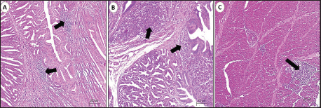 Fig. 1. Photomicrograph of the cerebrum of AEV-infected broiler chickens. (A) Lymphocytic encephalitis with perivascular cuffing (arrow). (B) Central chromatolysis of neurons (black arrows) and vasogenic edema (blue arrow). (c) Central chromatolysis of neurons (blue arrow) and astrocytosis (black arrows) (hematoxylin and eosin stain, Scale bar 200 μm). Neuronal degeneration and necrosis, accompanied by neuronophagia, were frequently observed, characterized by focal aggregation of activated microglial cells phagocytosing degenerated or necrotic neurons, particularly within the cortical layers. Additionally, affected areas demonstrated gliosis, which was manifested by the conspicuous proliferation and hypertrophy of microglial cells and astrocytes, reflecting a reactive glial response to neuronal injury. Prominent central chromatolysis was noted in multiple neurons, characterized by peripheral displacement of the neuronal nucleus and dissolution or loss of Nissl substance from the central cytoplasm, indicative of viral neurotropism-associated axonal injury and metabolic stress. Mild interstitial edema was present within the neuropil in some sections, further contributing to tissue disruption. Histopathological examination of the proventriculus (Fig. 2) revealed mild to moderate lymphocytic infiltration within the lamina propria and submucosa in approximately 50% of the examined samples. This infiltration was occasionally associated with submucosal edema and mild interglandular connective tissue expansion. In certain cases, the mucosa exhibited degenerative changes, including focal glandular epithelial atrophy and mild epithelial vacuolation, suggestive of chronic inflammatory insult. Histological sections of the gizzard revealed multifocal lymphocytic infiltration involving the submucosa and extending into the muscular layer. These inflammatory foci often accompanied by mild vascular congestion of mucosal and submucosal capillaries, without evidence of hemorrhage or necrosis. In most cases, the koilin layer remained largely intact, indicating a predominantly inflammatory rather than erosive process.