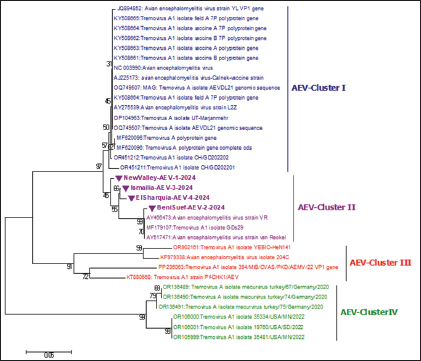 Fig. 4. A phylogenetic tree based on partial sequencing was generated using a 288-bp fragment of the VP1 gene from multiple AEV strains, along with GenBank reference sequences. The VP1 gene phylogeny indicated that the four AEV isolates (marked with violet triangles) clustered within cluster II. The tree was constructed using the Maximum Likelihood method with 1,000 bootstrap replicates in MEGA 7.0 software, applying the Kimura 2-parameter model. Table 3. Data of recent isolates used for the partial sequencing analysis of the AEV-VP1 gene.