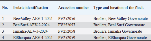 ABSTRACTBackground: Avian encephalomyelitis (AE) is an imperative viral disease of avian species worldwide caused by the AE virus (AEV). Aim: This retrospective study aimed to genetically characterize field AEV strains circulating in the local governorates of Egypt and assess their genetic divergence in comparison with commercially available vaccines. To the best of our knowledge, this is the first described study of AEV-VP1 gene sequencing and phylogeny in broilers in Egypt. Methods: A total of 150 tissue specimens from broilers of four Egyptian governorates were used for isolation and genetic characterization. The samples were tested for other pathogens, including egg drop syndrome virus, Newcastle disease virus, avian reovirus, avian reticuloendotheliosis virus, infectious bronchitis virus, Chicken anemia virus, and Marek’s disease virus. Results: Young chicks showed neurological symptoms and a mortality rate of 4%–8%. Only crop impaction and distended proventriculus were observed in sick chicks. Histopathological findings revealed typical lesions of lymphocytic encephalomyelitis in the cerebrum with mononuclear cuffing of perivascular spaces in the cortex and medulla. The proventriculus revealed mild lymphocytic infiltration within the submucosa. Typical pathological changes in leg rigidity and encephalomalacia were observed in specific pathogen-free embryonated chicken eggs (SPF-ECE). Regarding reverse transcriptase quantitative polymerase chain reaction (RT-qPCR), 8 (8/150) samples were positive with a prevalence rate of 5.3%, and the screening results were negative for other viral infections. The 4 selected positive samples were amplified using a one-step conventional RT-PCR assay for partial sequencing of the AEV-VP1 gene. Interestingly, the phylogenetic analysis exhibited that AEV isolates belong to cluster II within the same clade of Chinese strains and have a genetic similarity to Chinese, Iranian, American vaccinal, and British isolates, with 94%–98%a nucleotide similarity, and 96%–99% amino acid identity. Conclusion: Continuous monitoring and potentially updating the vaccination strategies in a timely manner are necessary to ensure vaccine effectiveness as an efficient control strategy in poultry flocks. Keywords: Avian encephalomyelitis virus, Young chicks, VP1 gene, Sequencing, Broilers. IntroductionAvian encephalomyelitis (AE) is a highly contagious viral disease that affects several avian species, including chickens, turkeys, pigeons, and quails. The disease is caused by the AE virus (AEV), which spreads readily among susceptible birds (Swayne et al., 2017; Hauck et al., 2017). AE typically manifests at an early age in broilers, most commonly between 1 and 3 weeks of age. Clinical disease may appear as early as 3–7 days after hatching, particularly in cases of vertical transmission from infected breeder hens. AEV is clinically characterized by typical neurological symptoms, such as ataxia, paresis, paralysis, muscular dystrophy, abnormal gait, and rapid head and neck tremors, with high morbidity and variable mortality in young infected chicks (Ali et al., 2021; Zhang et al., 2023). In addition, tremovirus A comprises two distinct strain categories: a natural enterotropic strain that usually infects the offspring of chicks and a neurotropic embryo-adapted strain. AEV transmission can occur horizontally via the fecal-oral route and vertically by infected embryonated eggs. In particular, vertical transmission leads to the development of pronounced neurological signs in newly hatched chicks and poses a serious risk to the poultry sector. The disease prevalence in affected birds ranged from 40% to 60%, with an average mortality rate of 25%. In contrast, AVE infection in adult birds is typically subclinical and is mainly associated with reduced egg production and decreased hatchability of fertile eggs, without neurological manifestations (Torre et al., 2018; Zhang et al., 2023). AEV is structurally classified within the genus Tremovirus of the family Picornaviridae (Ali et al., 2021). Its genome consists of a single-stranded, positive-sense RNA approximately 7.5 kb in length and contains a single large open reading frame (ORF) that encodes a polyprotein precursor (Ali et al., 2021). Similar to other picornaviruses, this polyprotein precursor is subsequently cleaved by intracellular proteases into three primary precursor proteins—P1, P2, and P3—yielding 11 structural and non-structural proteins. The P1 region encodes the four major structural proteins VP4, VP2, VP3, and VP1, whereas the P2 and P3 regions encode the nonstructural proteins 2A, 2B, 2C, 3A, 3B, 3C, and 3D (Lin et al., 2018). Notably, the VP1 capsid protein within the P1 region serves as a genetic diagnostic marker for AEV and constitutes the principal immunogenic protein responsible for inducing protective host immune responses (Wei et al., 2008; Hauck et al., 2017). Since the AEV outbreak was identified in the United States of America in 1930, it has achieved a worldwide endemic distribution, with sustained circulation reported across North America, Europe, Asia, Africa, the Middle East, and South America, particularly in regions with intensive poultry production (Braune and Gentry, 1971; Wang et al., 2023). Generally, AEV infection is confirmed either by detecting the virus through molecular diagnostic methods, including polymerase chain reaction, or by isolating the virus (Haryanto et al., 2016; Senties-Cue et al., 2016; Goto et al., 2019). Furthermore, serological assays, such as agar gel diffusion, virus neutralization, and chicken embryo susceptibility tests, can support diagnosis when interpreted alongside clinical findings (Pohjola et al., 2017; Taunde et al., 2017; Ali et al., 2021; Gethoffer et al., 2021). At present, no specific antiviral treatment is available; therefore, vaccination regimes remain the most effective strategy for AEV control and are significant in minimizing losses (Lin et