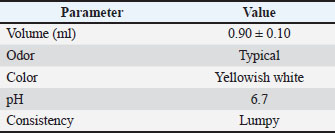 Table 1 summarizes the macroscopic characteristics of fresh Dorper ram semen (n=8 ejaculates). All ejaculates exhibited normal physical characteristics, including typical odor, yellowish-white color, and lumpy consistency, indicating good semen quality suitable for further processing. The semen pH was consistent among samples.