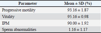 The fresh Dorper ram semen used in this study exhibited high baseline quality prior to dilution and storage, as evidenced by elevated progressive motility, sperm vitality, and IPM integrity, along with a low proportion of abnormal spermatozoa. These findings confirm that all ejaculates met the minimum quality requirements for semen preservation studies. High initial semen quality is widely recognized as a prerequisite for successful liquid semen storage, as ejaculates with suboptimal baseline characteristics are more susceptible to accelerated deterioration during preservation (Bustani and Baiee, 2021).
