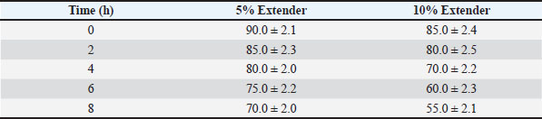 A reduction in sperm quality parameters was observed immediately after dilution and equilibration compared with fresh semen. This initial decline is commonly attributed to handling procedures, osmotic adjustment, and temperature equilibration, which may transiently affect sperm membrane stability and metabolic homeostasis. Similar post-dilution reductions in sperm motility and membrane integrity have been consistently reported in ram semen preservation studies and are considered a normal physiological response rather than an indication of extender inadequacy (Gil et al., 2011).