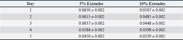 The sperm quality parameters during refrigerated storage are shown in Tables 68. Progressive motility, sperm vitality, and IPM integrity declined gradually throughout the 5-day storage period in both extender groups (p < 0.05).