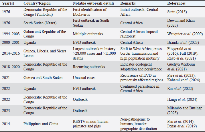 Open Vet. J.. 2026; 16(2): 768-787 Open Veterinary Journal, (2026), Vol. 16(2): 768-787 Review Article Ebola virus disease: A persistent challenge in global health securityMuniroh Muniroh1,2*, Luluk Hermawati3, Fathurrohim Fathurrohim4, Siti Darifah5, Lola Febriana Dewi6, Neshya Ruriana Putri7, Yessy Andriani Fauziah8, Eveline Yulia Darmadi8, Dwi Setianingtyas9, Aswin Rafif Khairullah10, Abdul Hadi Furqoni11 and Bima Putra Pratama121Graduate School Student, Universitas Islam Negeri (UIN) Syarif Hidayatullah Jakarta, South Tangerang, Indonesia 2Department of Clinical Pathology, Faculty of Medicine, Universitas Islam Negeri (UIN) Syarif Hidayatullah Jakarta, South Tangerang, Indonesia 3Department of Medical Biology, Faculty of Medicine and Health Sciences, Universitas Sultan Ageng Tirtayasa, Serang, Indonesia 4Department of Microbiology, Faculty of Medicine, Universitas Sriwijaya, Palembang, Indonesia 5Department of Community Medicine, Faculty of Medicine and Health Sciences, Universitas Sultan Ageng Tirtayasa, Serang, Indonesia 6Department of Oral Biology, Dentistry Study Program, Faculty of Medicine, Universitas Sriwijaya, Palembang, Indonesia 7Department of Clinical Pathology, Faculty of Medicine, Universitas Sultan Ageng Tirtaysa, Serang, Indonesia 8School of Dental Medicine, Universitas Ciputra, Surabaya, Indonesia 9Department of Oral Medicine, Faculty of Dentistry, Universitas Hang Tuah, Surabaya, Indonesia 10Research Center for Veterinary Science, National Research and Innovation Agency (BRIN), Bogor, Indonesia 11Center for Biomedical Research, National Research and Innovation Agency (BRIN), Bogor, Indonesia 12Research Center for Process Technology, National Research and Innovation Agency (BRIN), South Tangerang, Indonesia *Corresponding Author: Muniroh Muniroh. Universitas Islam Negeri (UIN) Syarif Hidayatullah Jakarta, South Tangerang, Indonesia. Email: muniroh.sps.uinjkt [at] gmail.com Submitted: 22/11/2025 Revised: 01/01/2026 Accepted: 09/01/2026 Published: 28/02/2026 © 2026 Open Veterinary Journal