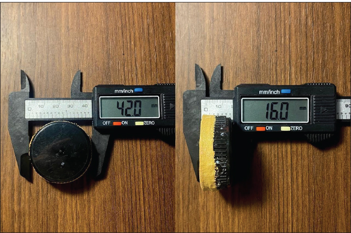 Fig. 1. Occluding device design with measurement. Animals used and experimental designTo validate the effectiveness of the occluder design for inducing dopamine, the device was tested in 2 to 3-month-old male New Zealand White rabbits (Oryctolagus cuniculus). Before the dopamine studies, the rabbits underwent a 7-day period of acclimatization in a controlled setting (temperature maintained at 22℃ and a 12-hour light/dark cycle) where they were provided with commercial feed, vegetables, and unlimited access to water. The health and ocular status of the rabbits were confirmed before they were included in the study. After acclimatization, dopaminergic activity was induced by occluding the eye with a black plastic cap for 30 consecutive days. For each rabbit, the right eye was assigned as the occluded eye, whereas the left eye served as the non-occluded fellow eye. Occlusion procedureThe cushioned occluder was placed over the right eye and secured in position using adhesive bandage tape. The tape was circumferentially wrapped around the head and neck, posterior to the ears, to prevent occluder dislodgement due to scratching or grooming behavior. Eye occlusion was maintained continuously for 30 days. The occluder and bandage tape were replaced every 3 days under minimal lighting conditions to avoid unintended light exposure to the occluded eye. The rabbits wearing the occluder are shown in Figure 2.