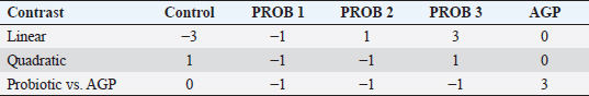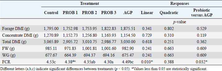 Statistical analysisTo evaluate the probiotic and AGP levels’ results concerning the productive parameters (forage DMI, concentrate DMI, total DMI, FW, WG, and FCR), an analysis of covariance (ANCOVA) was used. Given the increasing nature of probiotics’ doses, linear and quadratic polynomial contrasts were used to evaluate their effects (Table 2). Similarly, a contrast between the control and AGP groups was used to determine the differences between them. If statistical differences were found in the ANCOVA, the estimated marginal means were examined with pairwise comparisons to establish the difference between the groups, and subsequently, the optimal level of the probiotic. Statistical calculations were carried out with the help of the IBM Statistical Package for the Social Sciences Statistics 25 package. A significance level of 0.05 was used for all analyses. Ethical approvalThis study was approved by the Graduate School of the Faculty of Veterinary Medicine at the Universidad Nacional Mayor de San Marcos, Peru. Sampling procedures were carried out in accordance with the animal welfare protocols. ResultsTable 3 details the results obtained in this work. Regarding the consumption of dry matter, no significant statistical differences were found between the treatments with forage DMI, concentrate DMI, and total DMI (p=0.465, p=0.259, and p=0.399, respectively). The probiotics levels did not present a linear or quadratic response in relation to these treatments (p > 0.05). Regarding the guinea pigs’ final weight, there was no evidence of a significant difference between treatments (p=0.556). There was also no statistical difference regarding WG during the fattening period (p=0.556). Similarly, no linear or quadratic effect of increasing the probiotic levels was observed on the final weight or on WG during the fattening period in guinea pigs. Finally, there were statistical differences between treatments regarding FCR (p=0.045), revealing that the group that received the CONTROL treatment had the highest FCR, followed by the AGP group. On the contrary, the best FCR occurred in the PROB 3 group (p < 0.05). In addition, significant statistical differences were found between CONTROL and PROB 2 (p < 0.05). A significant linear effect of increasing doses of the probiotics was found (p=0.010), which indicates that the higher the dose of probiotic supplementation, the lower the FCR. Additionally, a significant effect of the probiotic application was found (p=0.032). Table 3. Effect of probiotic levels on forage DMI, concentrate DMI, and total DMI in guinea pigs and on FW, WG, and FCR of guinea pigs for fattening.
