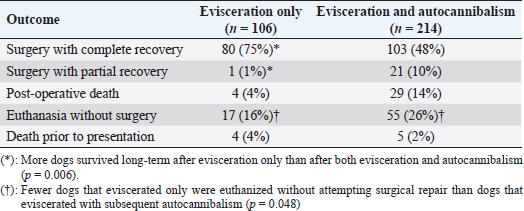 Open Vet. J.. 2019; 9(4): 327-330 doi: 10.4314/ovj.v9i4.9 Open Veterinary Journal, (2019), Vol. 9(4): 327–330 Original Research DOI: http://dx.doi.org/10.4314/ovj.v9i4.9 Post-surgical evisceration with or without autocannibalism in 333 dogs—a survey of veterinariansMark Rishniw1* and Lori R. Kogan21Veterinary Information Network, Davis, CA, USA 2Clinical Sciences Department, College of Veterinary Medicine and Biomedical Sciences, Colorado State University, Fort Collins, CO, USA *Corresponding Author: Mark Rishniw. Veterinary Information Network, Davis, CA, USA. Email: mark [at] vin.com Submitted: 26/02/2019 Accepted: 15/09/2019 Published: 09/12/2019 © 2019 Open Veterinary Journal AbstractBackground: Few reports of post-surgical evisceration, with or without autocannibalism, in dogs exist. Aims: To collect a large case series of dogs experiencing post-surgical evisceration, with or without autocannibalism. Methods: We surveyed practicing veterinarians who were members of the Veterinary Information Network about their experiences with post-surgical evisceration in dogs, variably accompanied by autocannibalism (ingestion of eviscerated organs or tissues). Responses were analyzed using descriptive statistics. Results: We identified 333 cases with sufficient information for analysis: 221 with evisceration and autocannibalism, and 112 with just evisceration. Most cases occurred following surgery for reproductive reasons (desexing, cesarean section, and pyometra). Most occurred in young adult or adult dogs. Most dogs received analgesia perioperatively had routine closure (simple interrupted or simple continuous muscle layer closure) and most did not wear an E-collar post-surgically. Most dogs eviscerated within 3 days of the initial surgery. Approximately 64% underwent surgical repair and survived long-term without complications, more frequently if the evisceration was not accompanied by autocannibalism. Conclusion: Our study suggests that post-surgical evisceration and autocannibalism can generally be successfully managed by practitioners and do not confer a uniformly poor outcome for the dog. Keywords: Dehiscence, Eventration, Ovariohysterectomy, Surgery, Trauma. IntroductionDogs, and occasionally cats, can suffer a breakdown of sutures that close a laparotomy, resulting in the evisceration of abdominal viscera (Gower et al., 2009). However, descriptions of circumstances surrounding these events are limited to a single case series of 12 animals. Completely undescribed is the phenomenon of subsequent autocannibalism of the abdominal viscera—essentially, eating one’s own eviscerated organs. One of the authors’ personal experience with such an event and discussion with colleagues prompted this study, designed to determine whether this event is as rare as initially suspected, and what outcomes might be expected for dogs presenting with post-surgical evisceration, with or without autocannibalism. Therefore, we created a survey to obtain additional information about such events and distributed it to veterinarians who are members of the Veterinary Information Network (VIN). We hypothesized that outcomes for dogs presenting with eviscerated (and ingested) abdominal viscera following routine laparotomy would have a reasonable clinical outcome in most cases. Materials and MethodsWe used an online survey system to gather recollections about dogs that had presented to veterinarians with abdominal evisceration, with or without autocannibalism. The survey was distributed by email on October 31st, 2018 to all veterinarians who were members of VIN, and remained open for responses from October 31st to November 15th, 2018. A single reminder email was sent on November 7th, 2018. No ethical review was sought or obtained as this was an anonymous survey. The survey asked respondents if they had ever been presented with a case of evisceration ± autocannibalism in a dog that had recently undergone a surgical laparotomy, and if they had been presented with a case, whether they had observed more than one case. For respondents answering “Yes”, they were asked a series of questions regarding the event(s). These included: (A) Whether the dog was a purebred (and if so, what breed) (B) Age of dog: puppy (<6 months), immature adult (6 months to <1 year of age), adult (1–9 years), or geriatric (>9 years) (C) Why the original laparotomy was performed (D) Whether or not the dog received perioperative analgesia (E) What abdominal closure pattern the original surgeon used (F) Whether or not the dog was wearing an Elizabethan collar at the time of evisceration (G) Whether the dog was a pet, shelter animal, or other (H) The ultimate outcome of the case (I) Reporting clinician’s type of practice when presented with the eviscerated case Because most of the survey relied on respondents’ recall, often without the benefit of medical records (due to changing of employment, retirement, etc.), we did not ask specific details about the types of repair, complications, or dates when these cases presented. We analyzed most of the data using descriptive statistics. We used Chi-square tests of independence to compare the ultimate outcomes of dogs suffering just evisceration with those that experienced evisceration with autocannibalism. ResultsThe survey was distributed to 38,531 members of VIN. Five-hundred and twenty-five veterinarians completed the survey. Of these, 233 (44%) reported never encountering a case of post-surgical evisceration; 260 (50%) reported seeing one case, 23 (4%) reported seeing two cases, and nine (2%) reported seeing three cases, for a total of 333 cases. Veterinarians reported on 221 cases (66%) where dogs both eviscerated and cannibalized their viscera, and 112 cases (34%) where dogs only suffered evisceration. Most respondents (90%) were working either in general practice or emergency practice when presented with their evisceration case(s). One hundred and forty-two dogs (43%) were mixed breed a